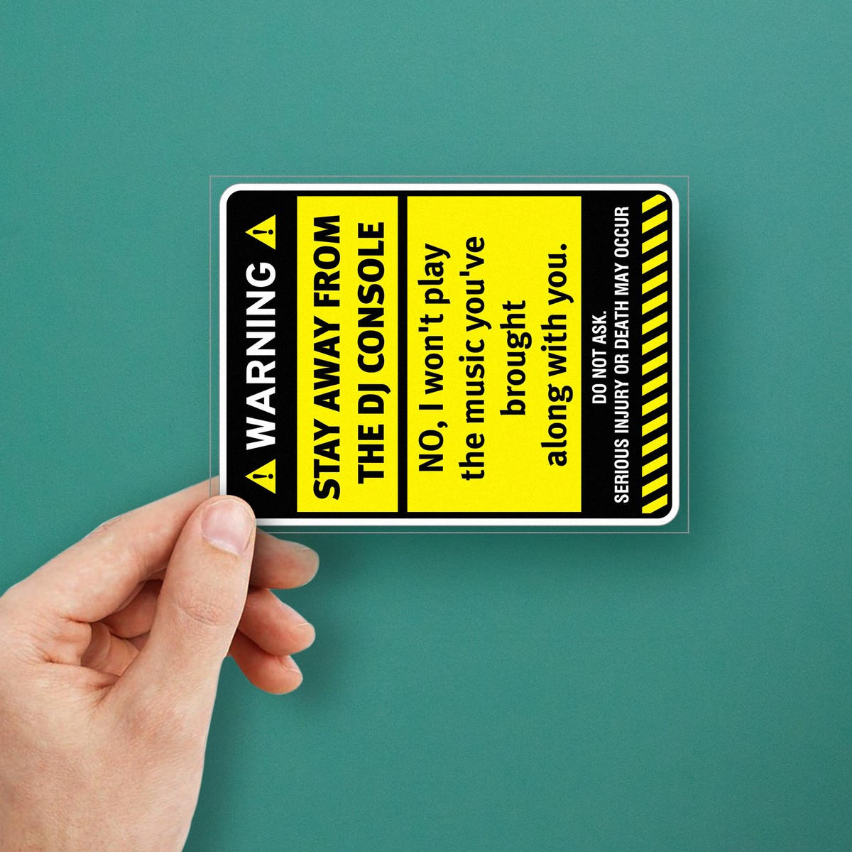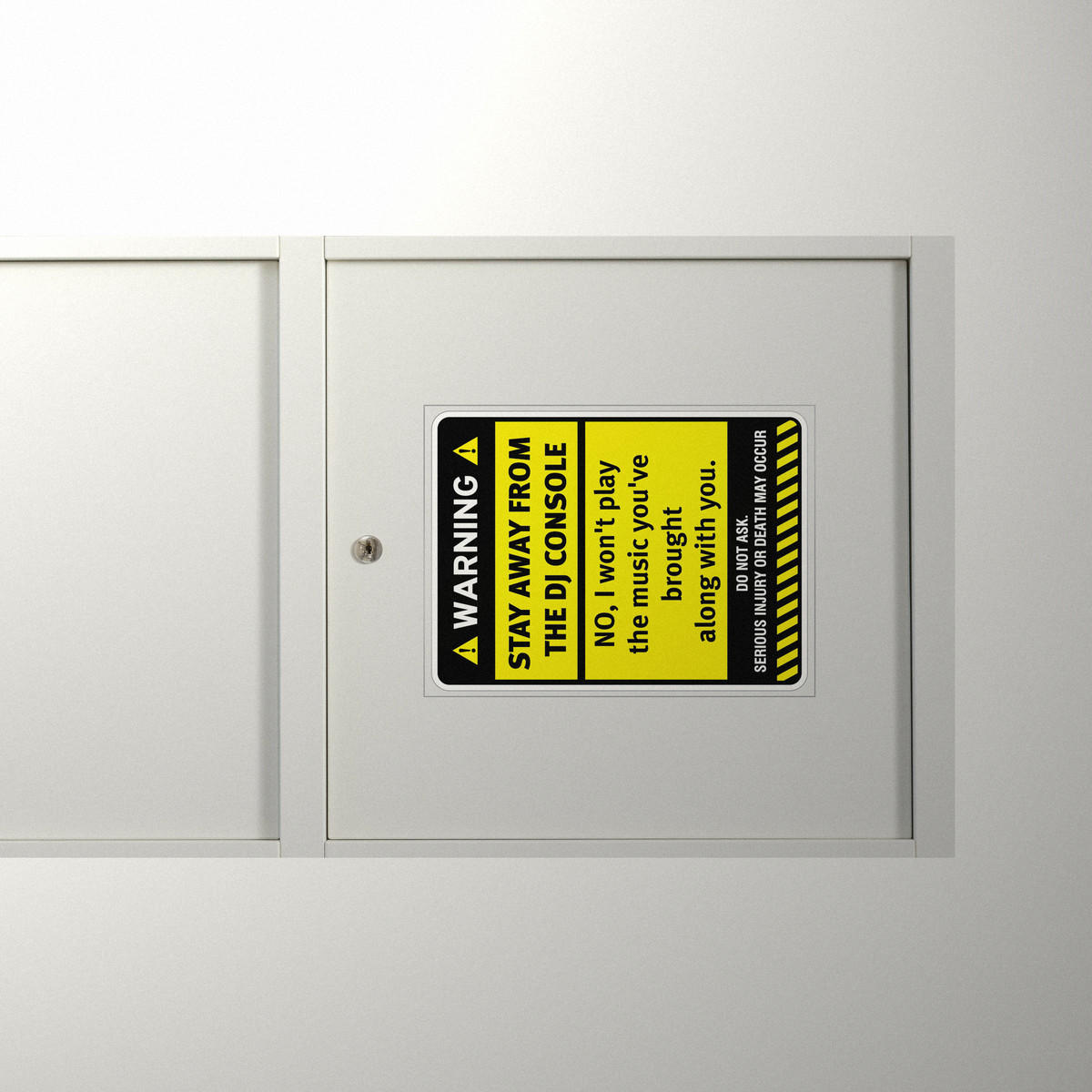 Add a touch of humor and set clear boundaries with this “Stay Away from the DJ Console” warning sticker. Perfect for DJs, this funny vinyl decal provides a lighthearted way to keep guests from interfering with your music setup. Its bold yellow and black design ensures high visibility, while the durable, weatherproof vinyl construction guarantees long-lasting use. Ideal for DJ consoles, booths, or equipment cases, this sticker is easy to apply and remove without residue, offering a convenient solution for personalizing and protecting your gear.