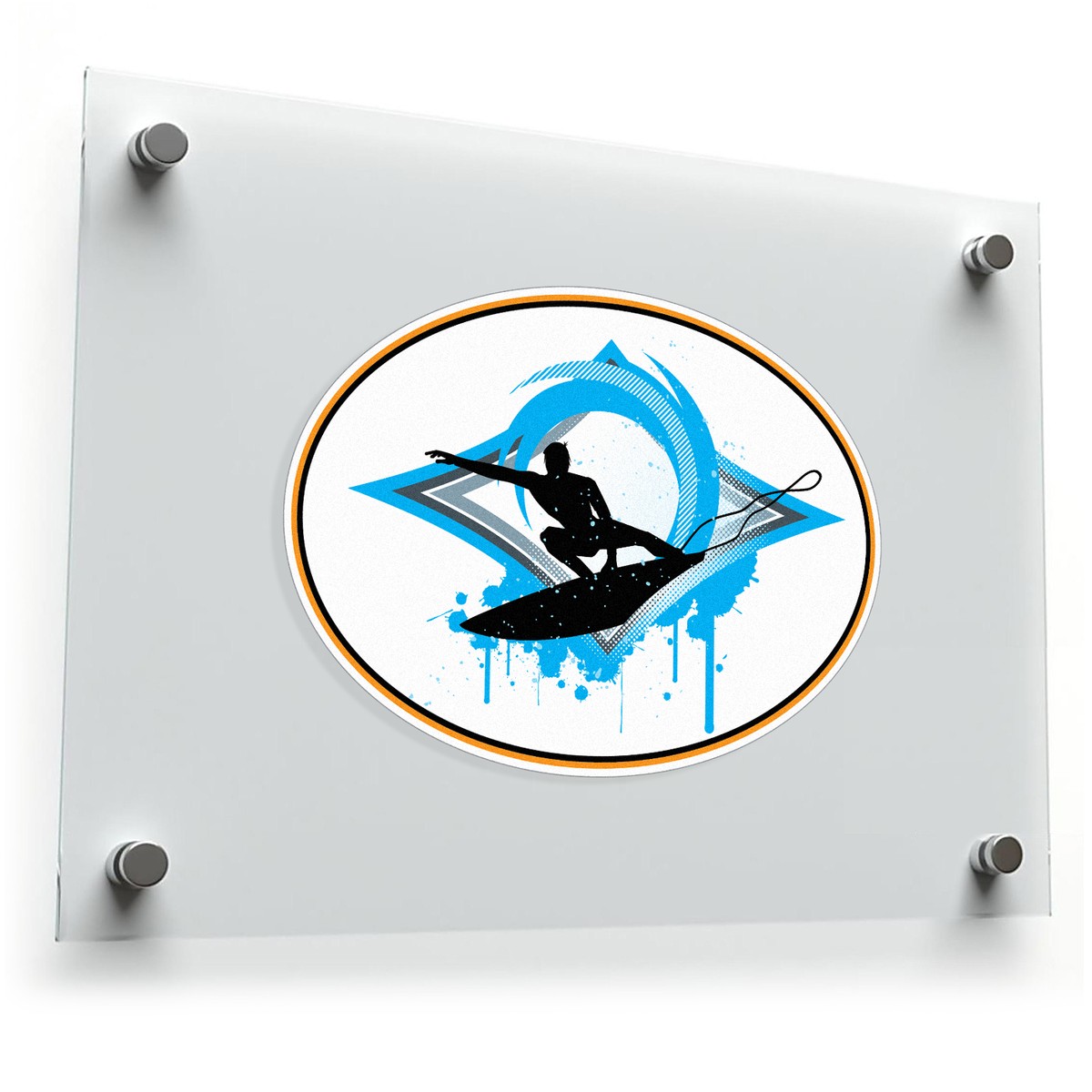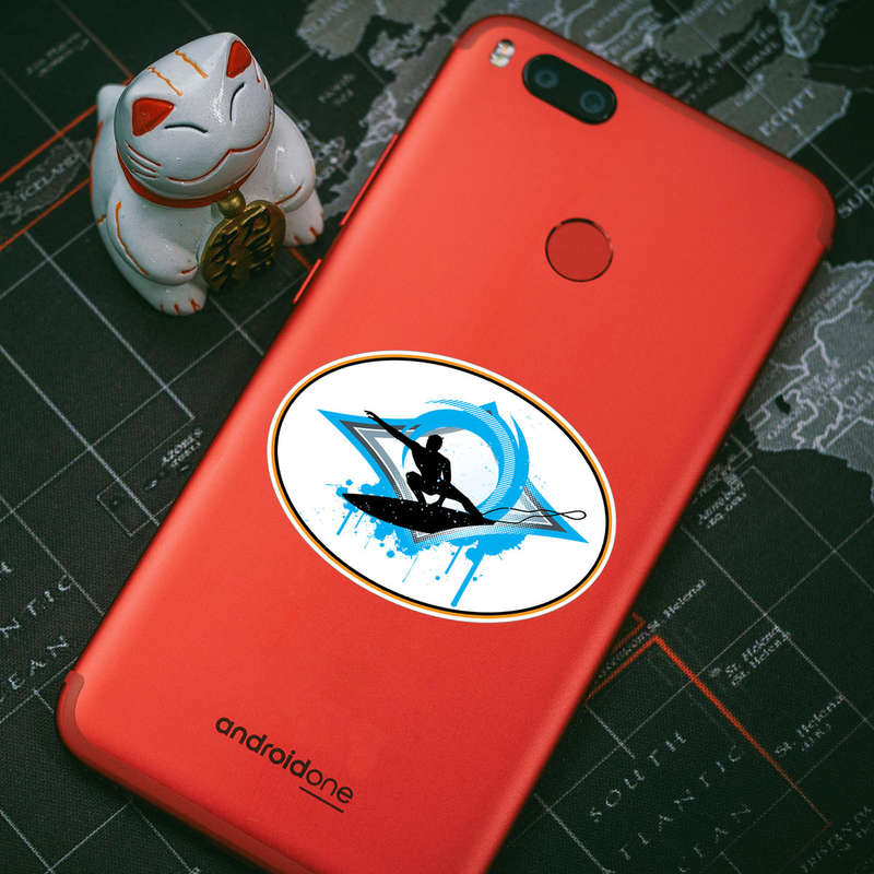 Surfer Silhouette Sticker 🏄 Dynamic Surfing Design: This sticker features a sleek silhouette of a surfer riding a wave, surrounded by vibrant blue splashes and geometric accents. A perfect choice for surf and adventure enthusiasts! 🏄