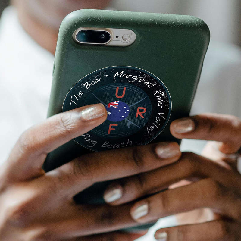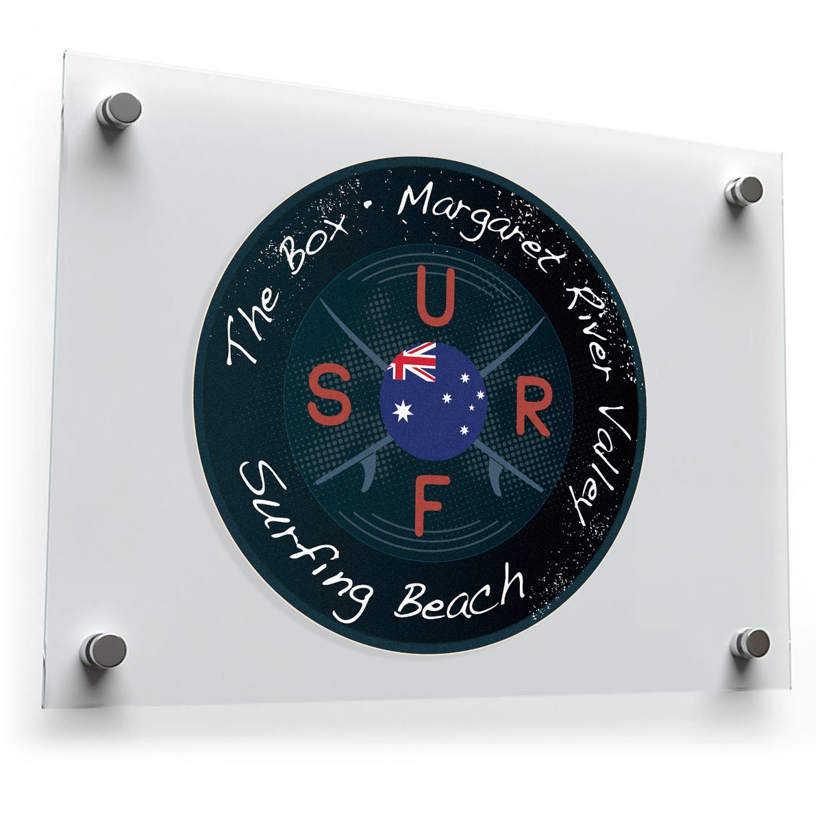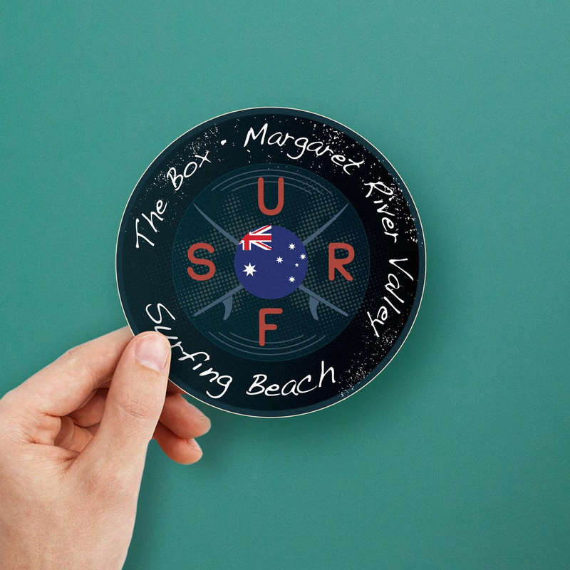 Celebrate the renowned waves of The Box in Margaret River Valley, Australia, with this bold surfing decal. Featuring a round design with crossed-surfboard graphics, an Australian flag accent, and sleek typography, this vinyl sticker is perfect for decorating laptops, car windows, or surfboards. Crafted from high-quality, weather-resistant vinyl, it maintains its vibrant colors and detailed design indoors or outdoors. Whether you’re a surfer, traveler, or coastal enthusiast, this sticker is a stylish way to carry the spirit of Margaret River’s iconic surf culture. Available in multiple sizes, it’s also a great gift for beach lovers and surf enthusiasts.