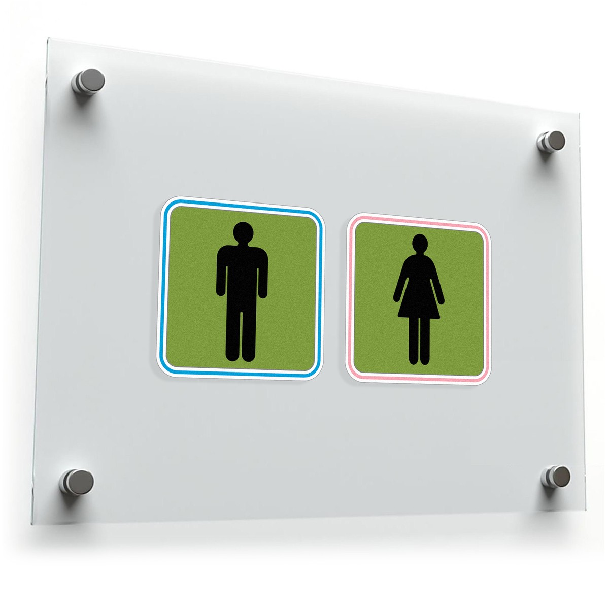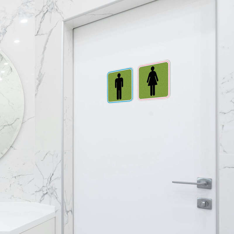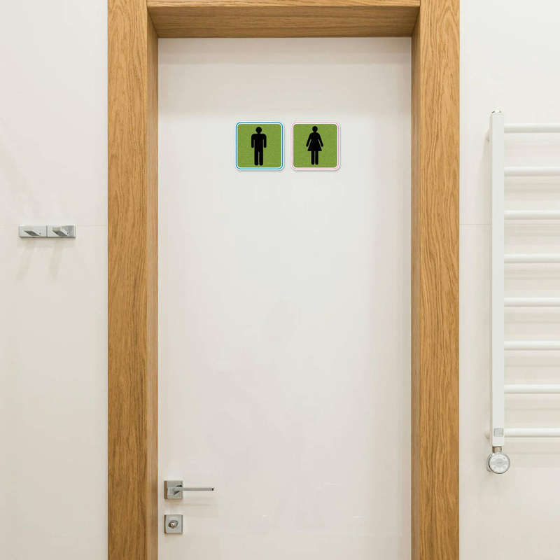 🟢 Modern Green Design: The vibrant green background with contrasting blue and pink borders adds a clean and contemporary touch to any restroom door or wall. 🟢