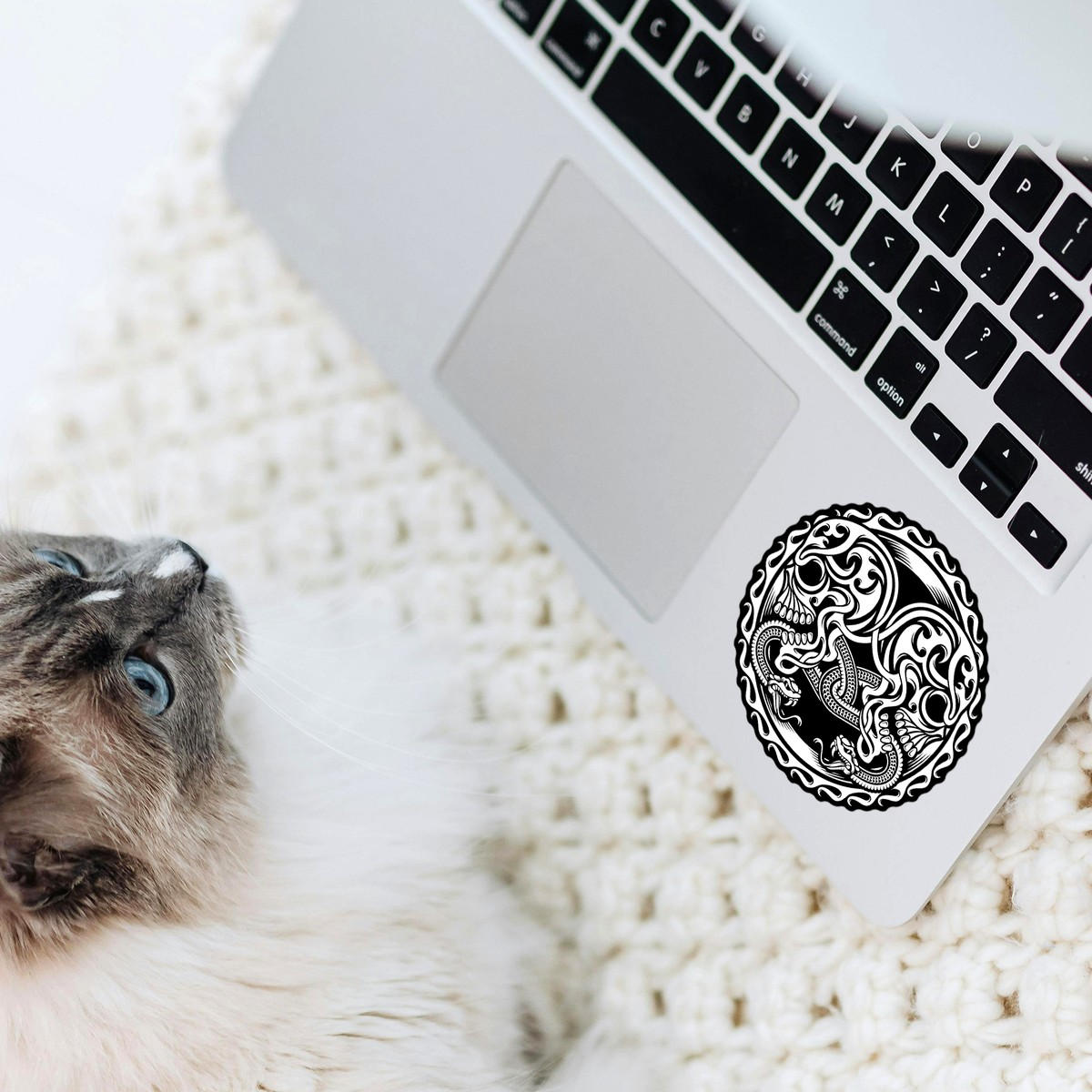 Embrace the mystique of Norse mythology with this Viking knotwork vinyl decal, featuring two intricately detailed dragons in a mesmerizing knotwork design. This durable and weather-resistant sticker is perfect for cars, laptops, or even as a bold piece of wall art. Made from high-quality vinyl, it resists wear and tear while maintaining its striking appearance. Its removable adhesive ensures easy repositioning without leaving behind any residue. Available in multiple sizes, this decal is ideal for history enthusiasts or anyone who appreciates the rich symbolism of Viking culture.