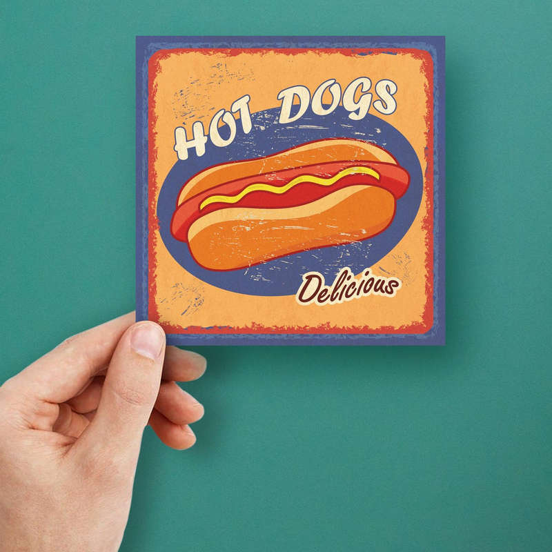 Bring a taste of vintage Americana into your decor with this retro hot dog sticker, featuring a delicious, mustard-topped hot dog illustration on a warm orange and blue backdrop. This vinyl decal, designed with a classic diner look, is perfect for adding personality to kitchens, cafes, or any space in need of a nostalgic touch. Its high-quality print captures vibrant colors with a slightly worn texture, evoking the charm of vintage signage. Available in multiple size options, this sticker offers an easy way to create a fun, food-inspired focal point in your home or business.