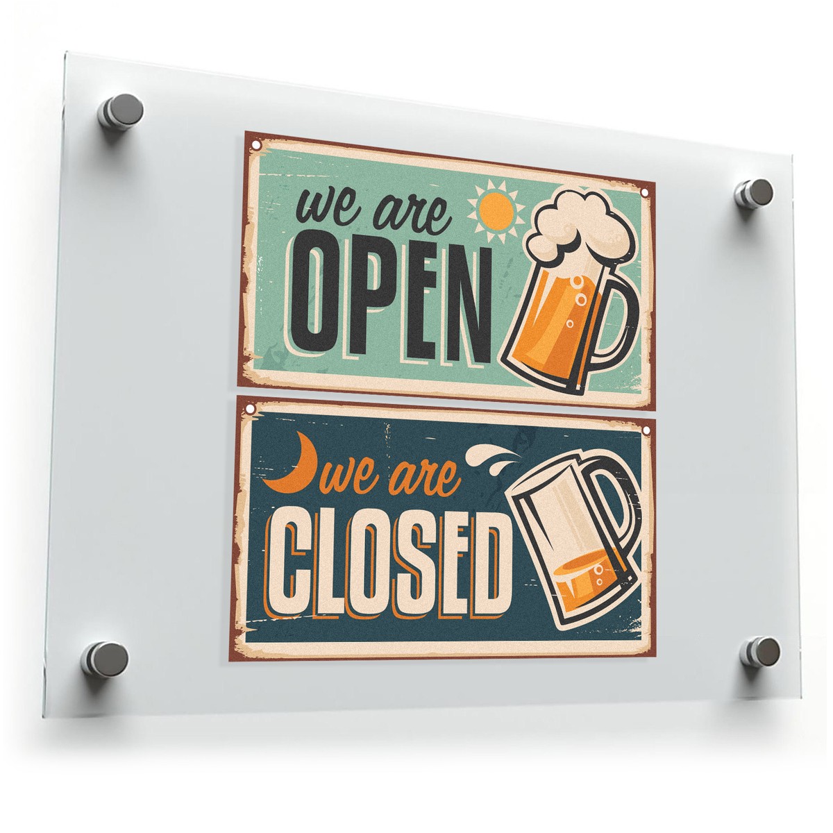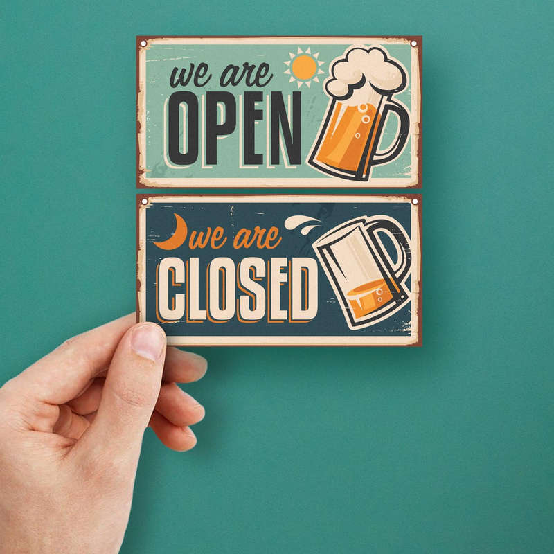 Add a touch of retro charm to your space with this double-sided “We Are Open/Closed” vintage sign. Featuring a playful beer mug design and distressed finish, this metal plaque is perfect for bars, cafes, and home decor enthusiasts looking for a nostalgic touch. The cheerful “We Are Open” side has a sun icon, while the “We Are Closed” side features a moon, capturing both day and night vibes in a single piece. Made from durable metal with pre-drilled holes, it’s easy to hang and built to withstand daily use. Available in multiple size options, it’s a versatile, eye-catching decor piece.