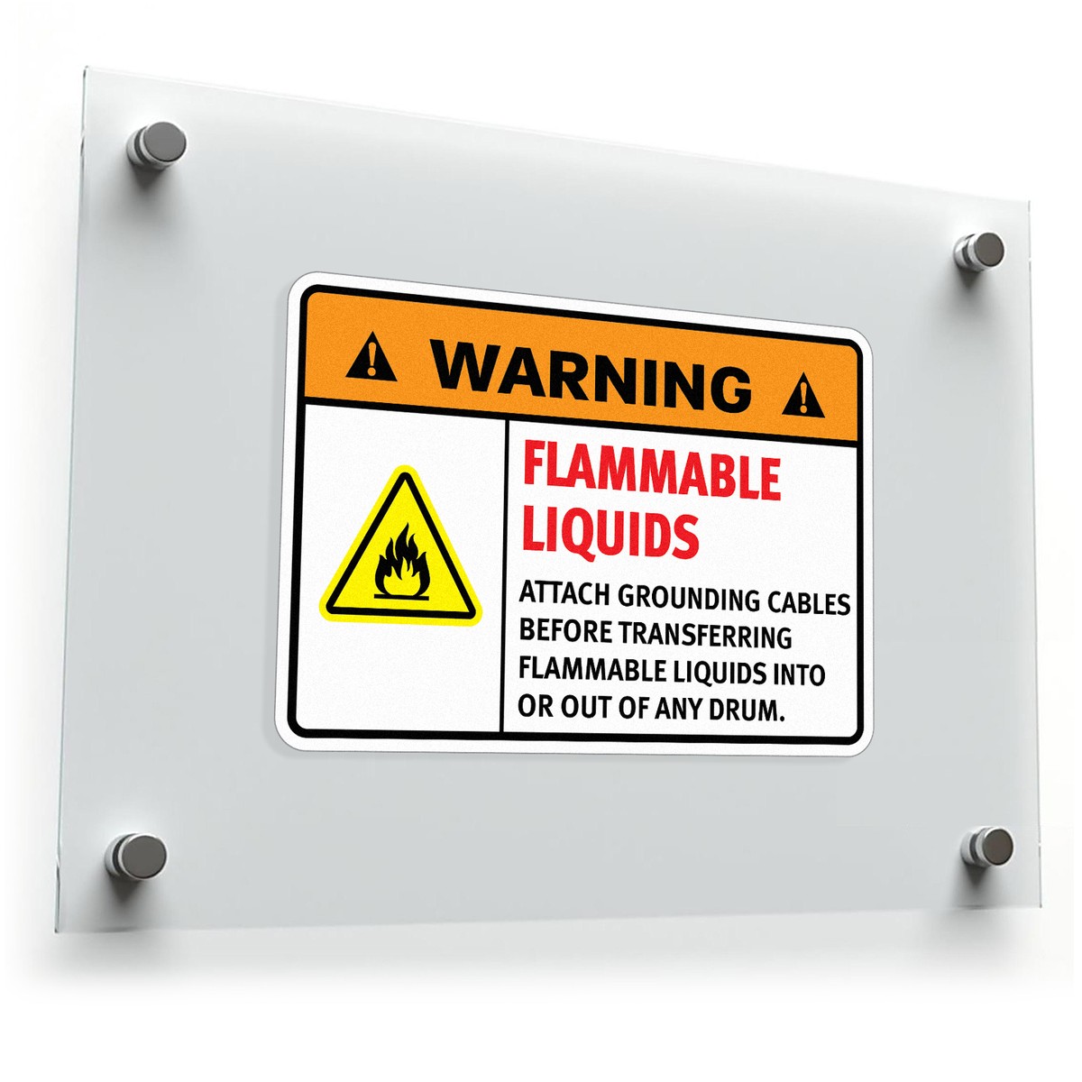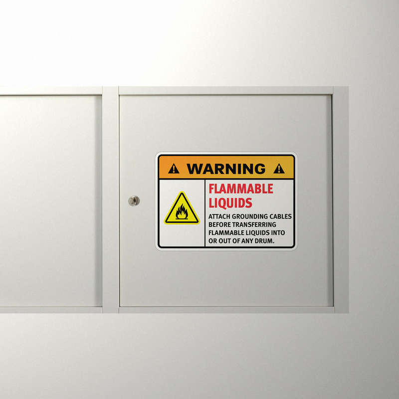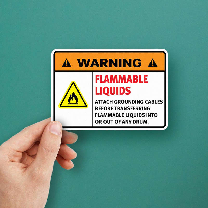 Promote workplace safety with this “Warning Flammable Liquids” sticker, designed to highlight the importance of attaching grounding cables during hazardous material transfers. Featuring bold red, black, and orange text with a striking flame graphic, this decal ensures high visibility and clear communication of safety protocols. Made from durable vinyl, it resists harsh chemicals, moisture, and extreme conditions, making it ideal for both indoor and outdoor use. Easy to apply on drums, walls, or equipment, this sticker provides a lasting reminder of critical safety precautions. Available in multiple sizes, it’s a practical tool for maintaining safety and compliance in hazardous environments.