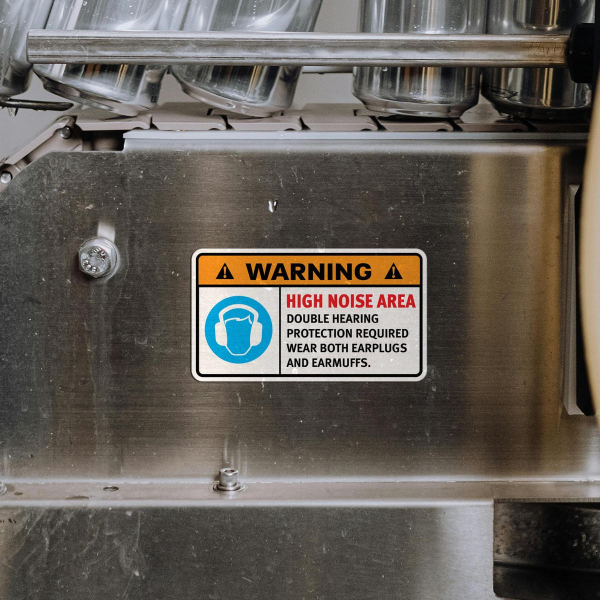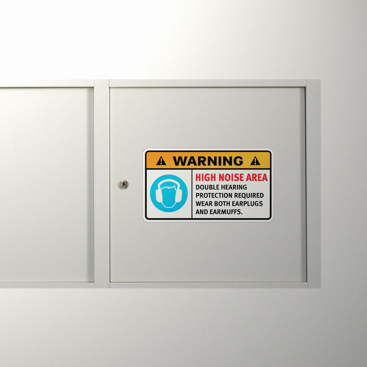 Ensure workplace safety with this durable “Warning: High Noise Area” safety sticker, designed to remind workers to wear both earplugs and earmuffs in areas with high noise levels. Crafted from long-lasting, waterproof vinyl, this decal is perfect for use in industrial settings such as factories, construction sites, and other work areas where hearing protection is essential. Its strong adhesive ensures it stays securely in place on a variety of surfaces, while the bold, OSHA-compliant design ensures it remains highly visible to all workers.