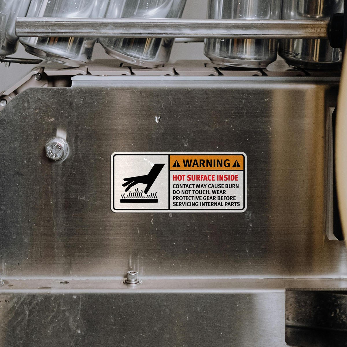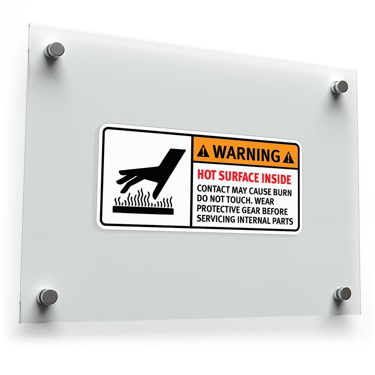 Promote workplace safety with this “Warning: Hot Surface Inside” decal. Designed to clearly communicate burn hazards, this safety sticker is perfect for industrial machinery and equipment. It serves as an essential reminder to wear protective gear before servicing hot surfaces. Made from durable, weather-resistant vinyl, this decal can withstand tough conditions while maintaining visibility. Easy to apply and remove without residue, it’s suitable for both temporary and permanent use, helping to keep your workplace compliant with safety regulations.