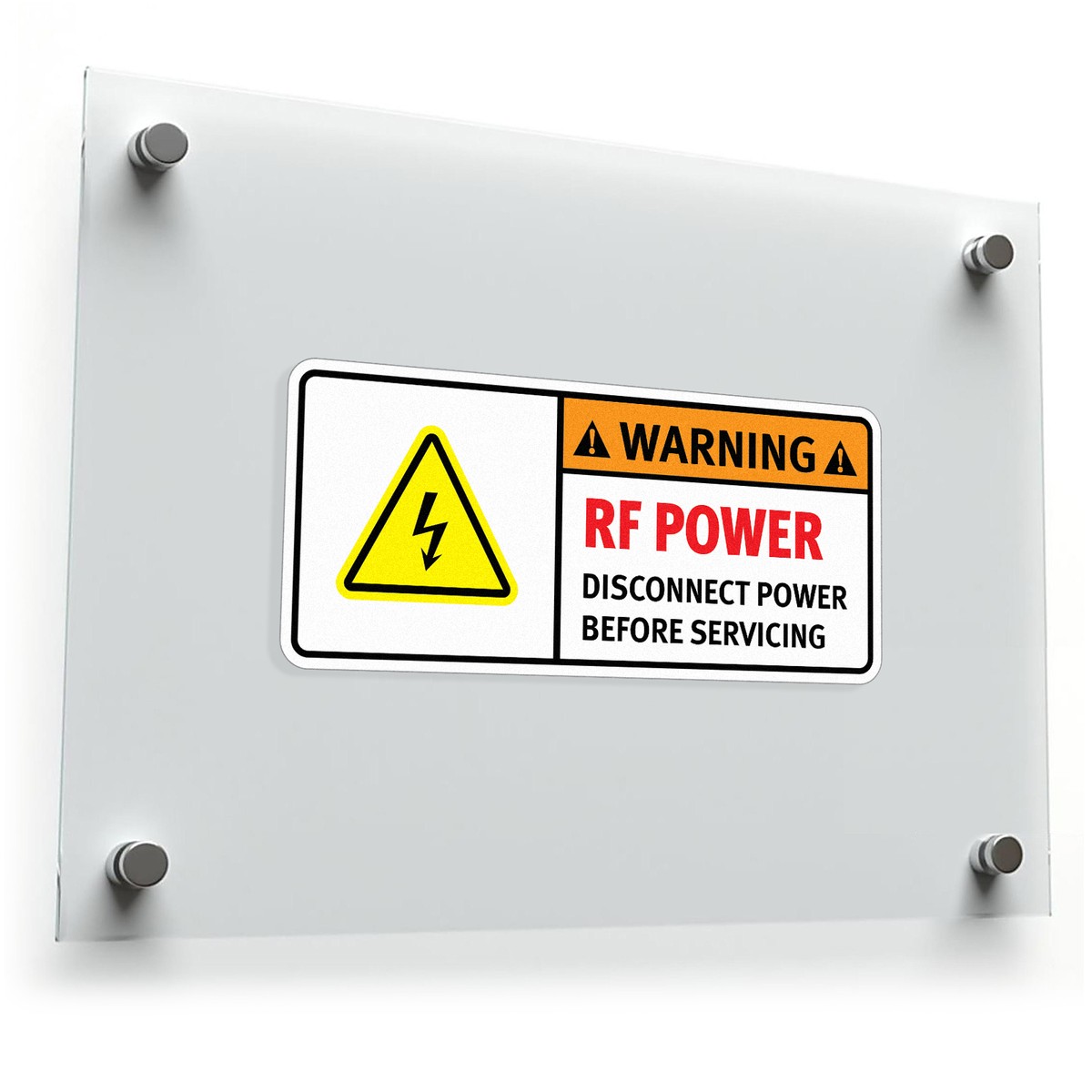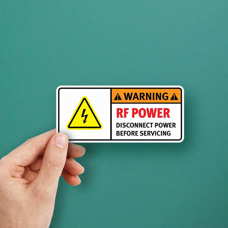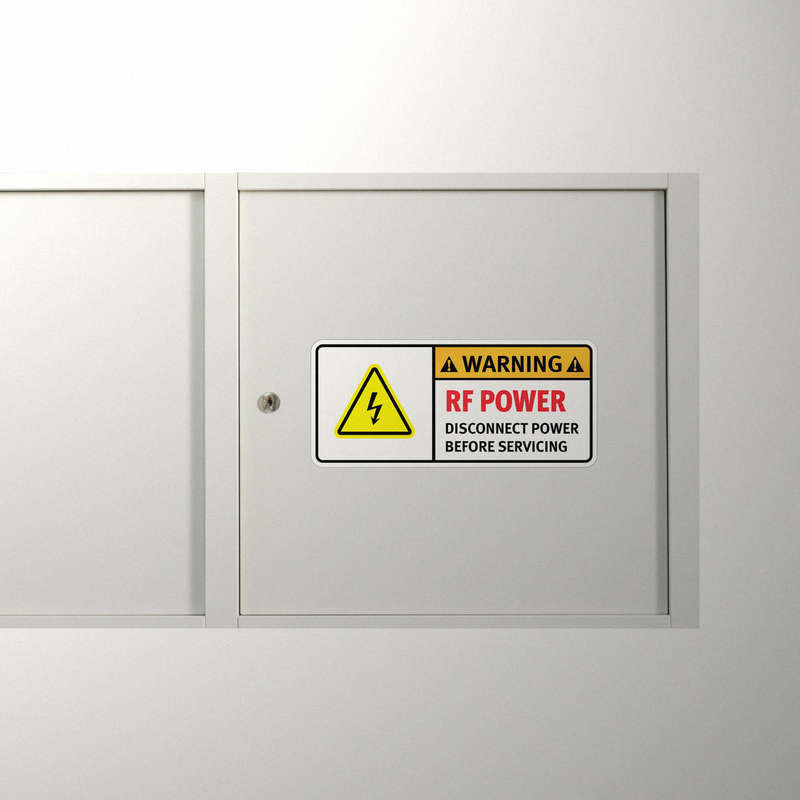 Ensure safety and clarity with this Warning RF Power Sticker. Designed to enhance workplace safety, this high-visibility decal features a bold message, “RF POWER – DISCONNECT POWER BEFORE SERVICING,” to prevent accidental power contact during maintenance. Made from durable vinyl, this sticker withstands tough industrial conditions, maintaining its vivid colors and strong adhesion over time. Ideal for use on machinery, electrical panels, and equipment, this easy-to-apply decal reinforces safety protocols in any setting. Available in multiple sizes to suit your safety needs, this sticker is an essential addition to industrial and commercial environments.