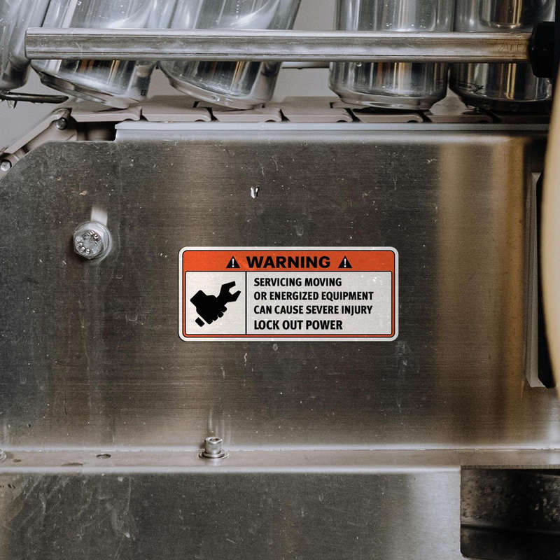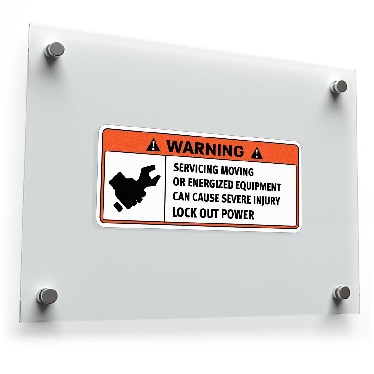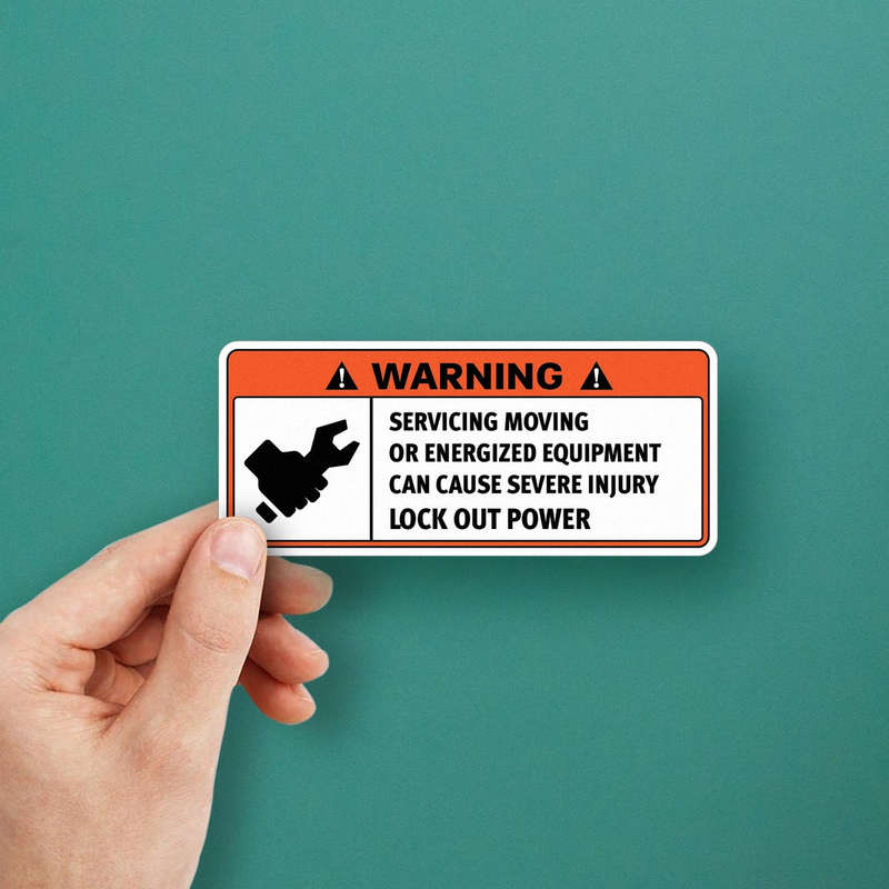The “Servicing Moving or Energized Equipment” warning sticker is a vital safety measure designed to alert workers to potential hazards during maintenance tasks. Its bold orange, black, and white design features clear text and visuals for maximum visibility. Made from durable vinyl, this sticker withstands harsh industrial conditions, including weather, wear, and UV exposure, making it suitable for both indoor and outdoor use. With multiple size options and a strong adhesive for effortless application, it can be easily installed on machinery or workstations. This safety decal helps reinforce OSHA compliance by emphasizing the importance of locking out power during servicing, ensuring a safer work environment.