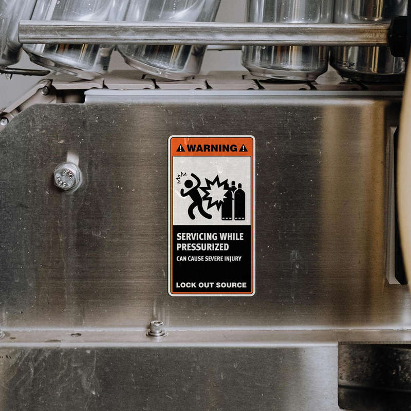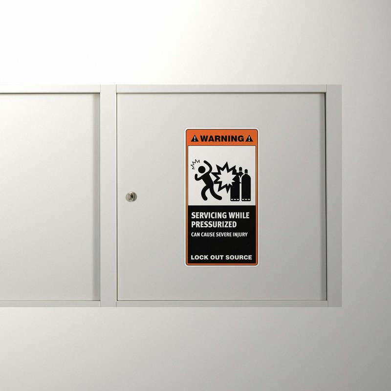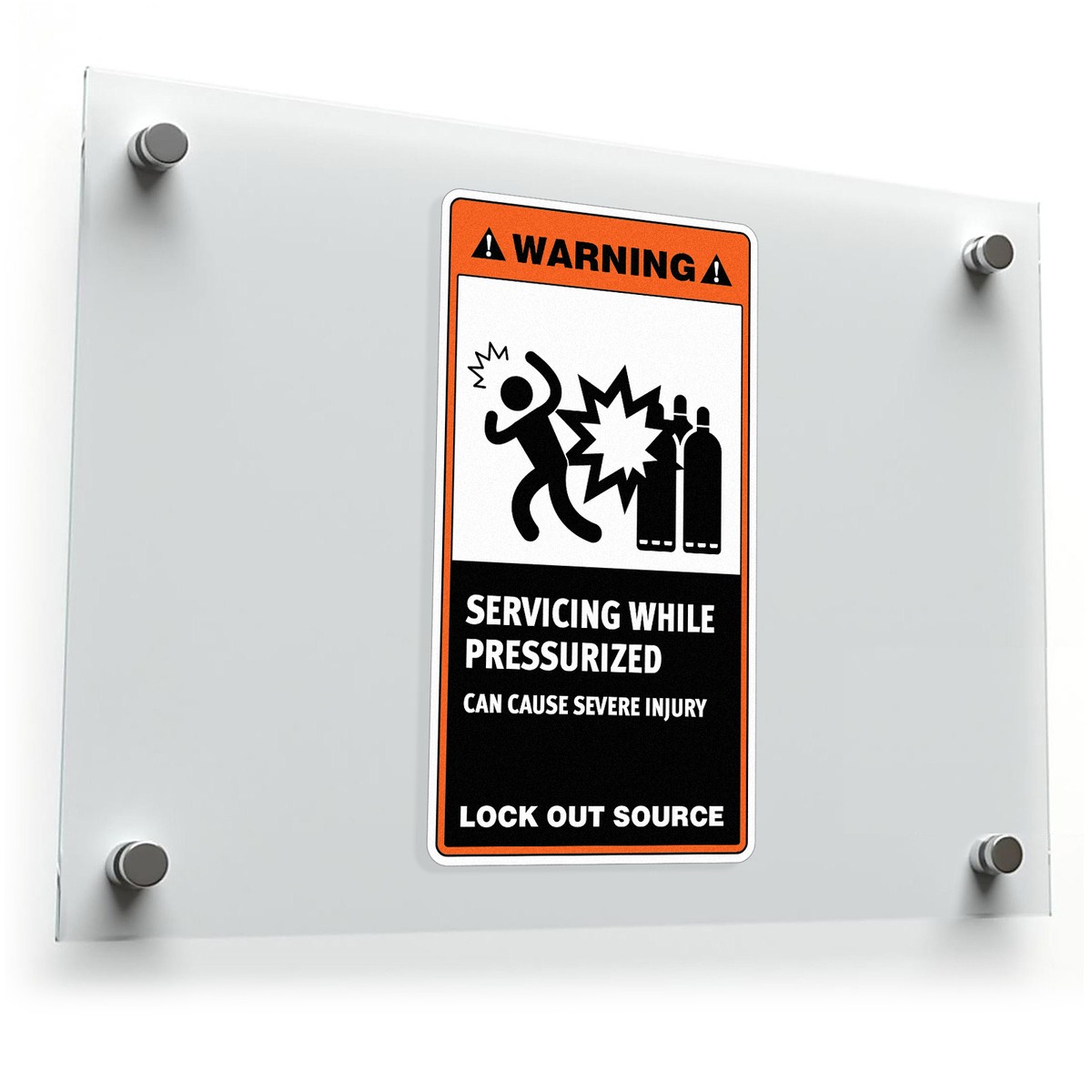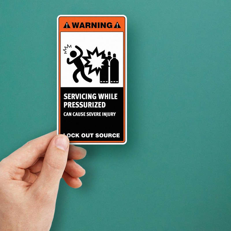 Promote a safer work environment with this “Servicing While Pressurized” warning sticker, designed to alert workers to potential injury risks. Featuring an attention-grabbing orange, black, and white design with bold text and a clear hazard graphic, this sticker ensures high visibility. Crafted from durable vinyl, it withstands wear, weather, and industrial conditions, making it ideal for indoor and outdoor applications. Its strong adhesive allows for quick installation on smooth surfaces, and multiple size options provide flexibility for diverse applications. This sticker is a crucial addition to enhance workplace safety and compliance, helping to prevent accidents and reinforce proper lockout procedures.