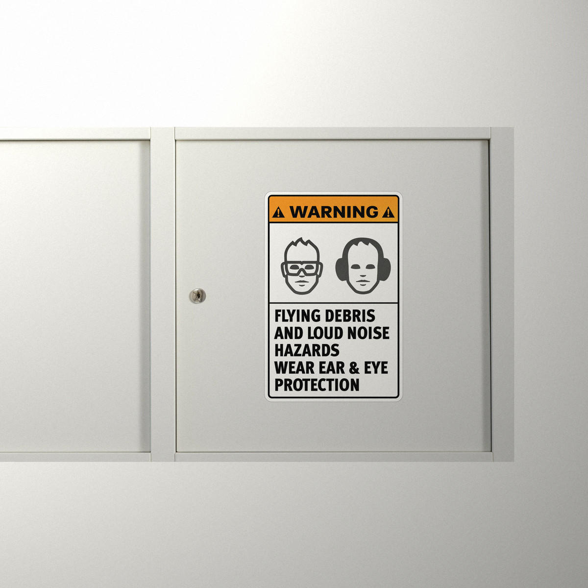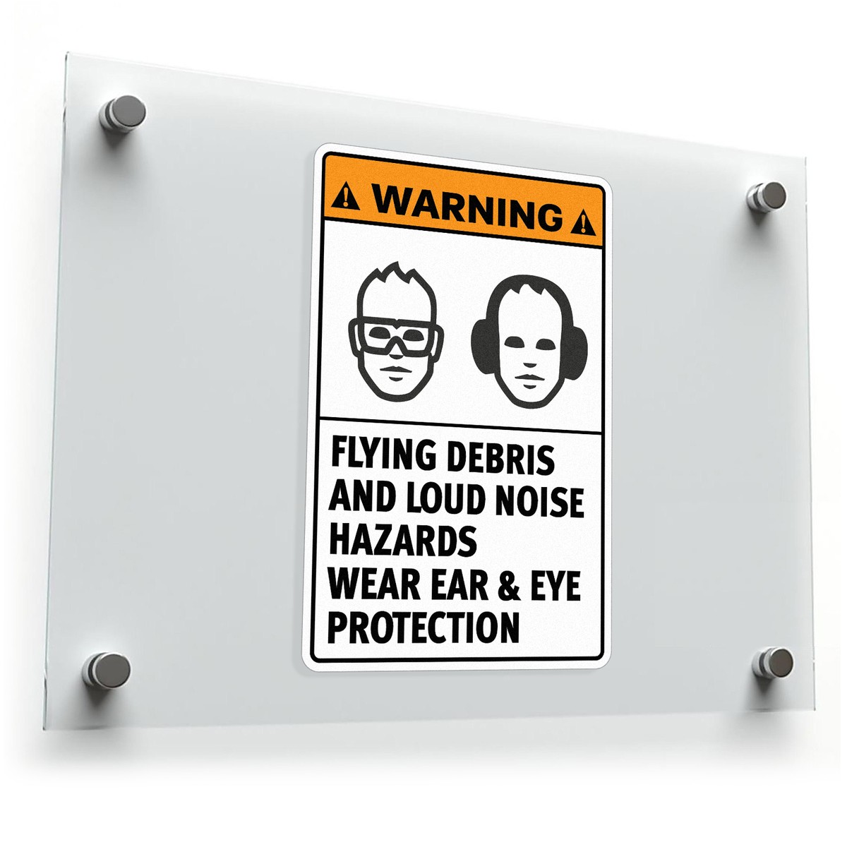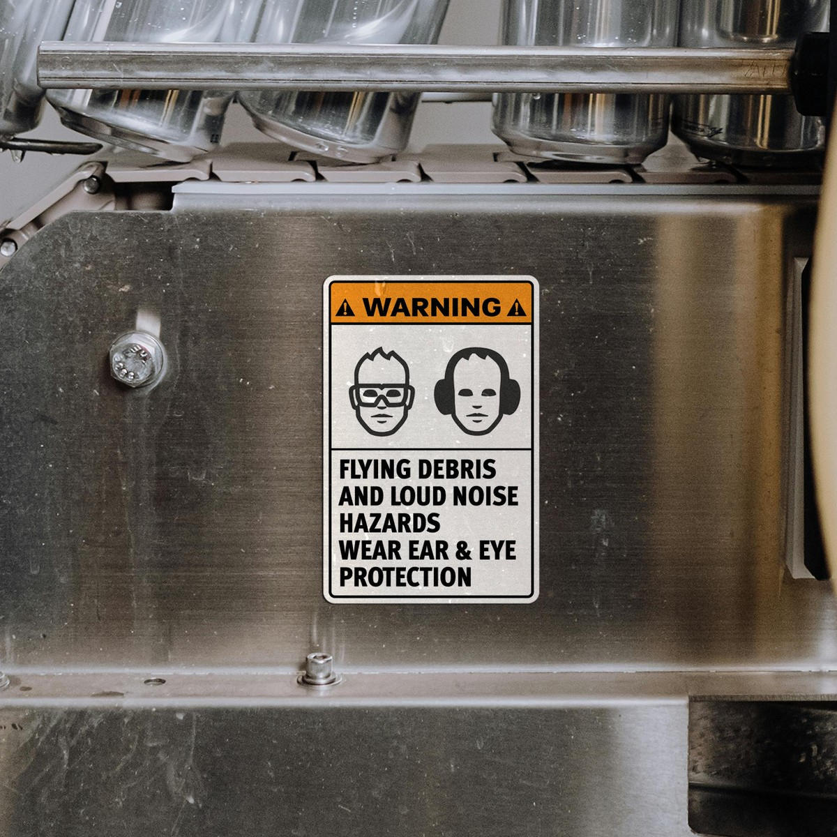 Warning Sign Sticker ⚠️ Clear Safety Warning: Ensure proper safety measures are followed with this bold warning sign sticker, featuring a clear message to wear ear and eye protection in hazardous environments. ⚠️