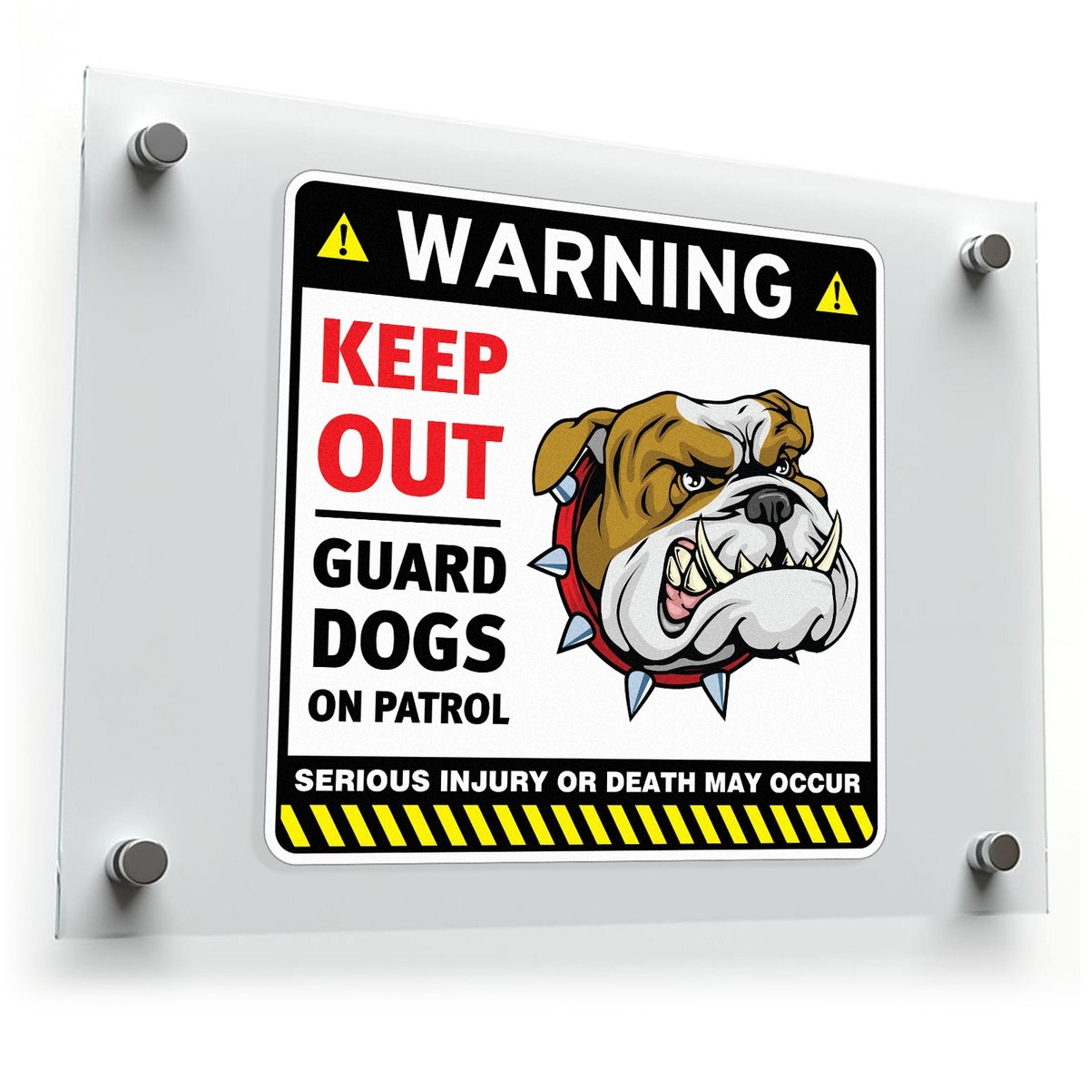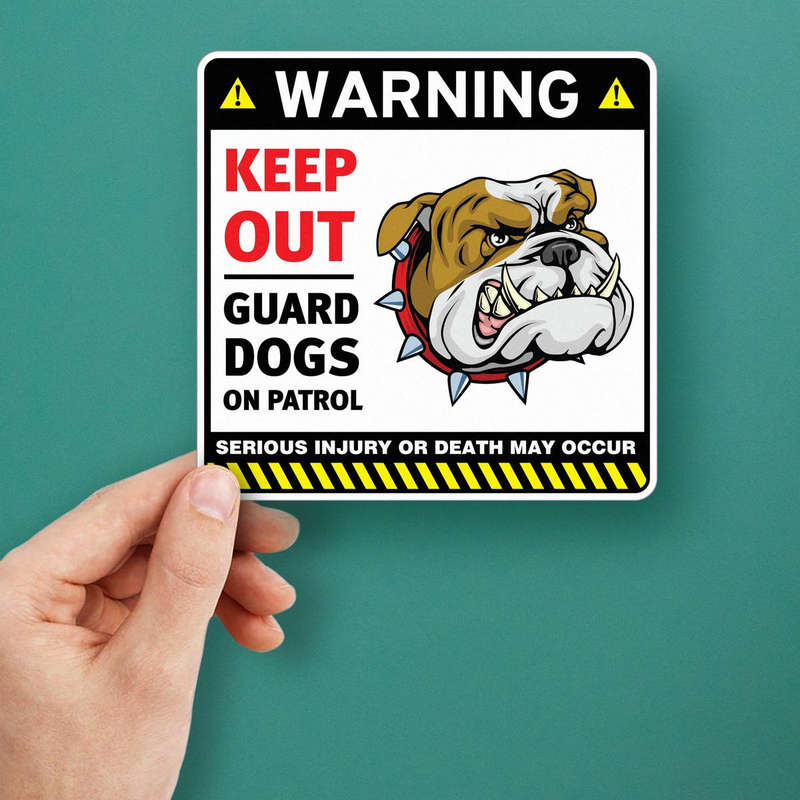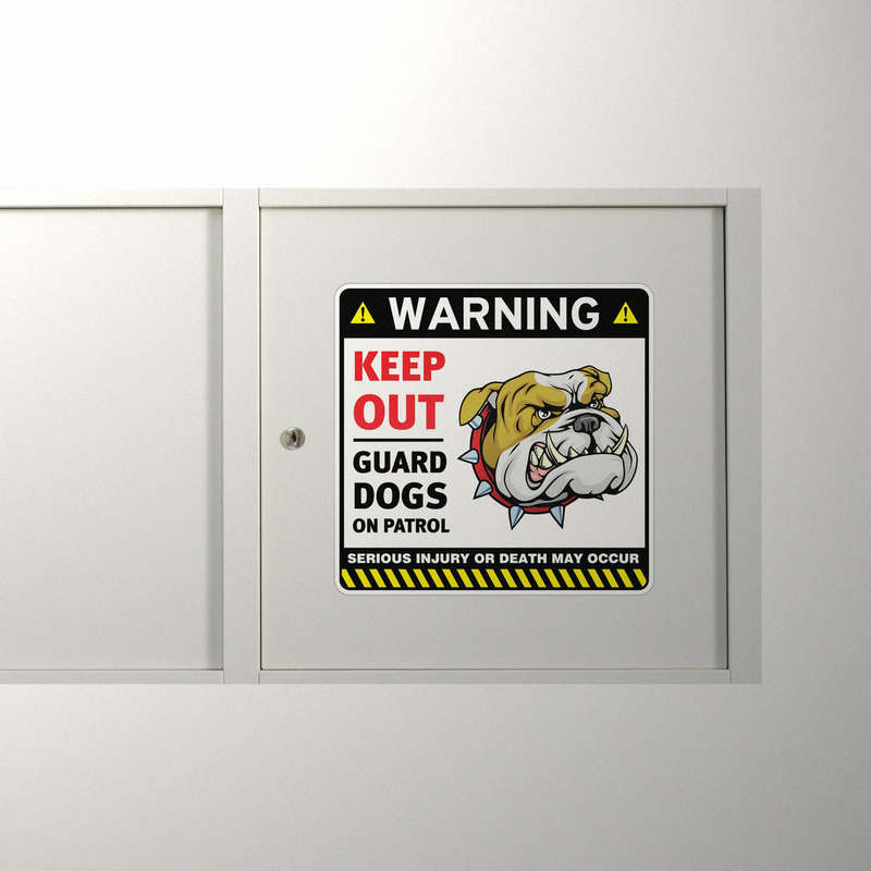 Ensure your home or business is well-protected with this bold “Keep Out Guard Dogs on Patrol” warning sign sticker. Featuring a fierce bulldog design and a clear, high-visibility message, this vinyl decal serves as an effective deterrent against potential intruders. Crafted from weatherproof vinyl, it’s perfect for outdoor use, ensuring it remains intact through rain, sun, and more. Ideal for both residential and commercial security, the sticker applies easily to any surface and removes cleanly without residue, providing a versatile solution for your safety needs.