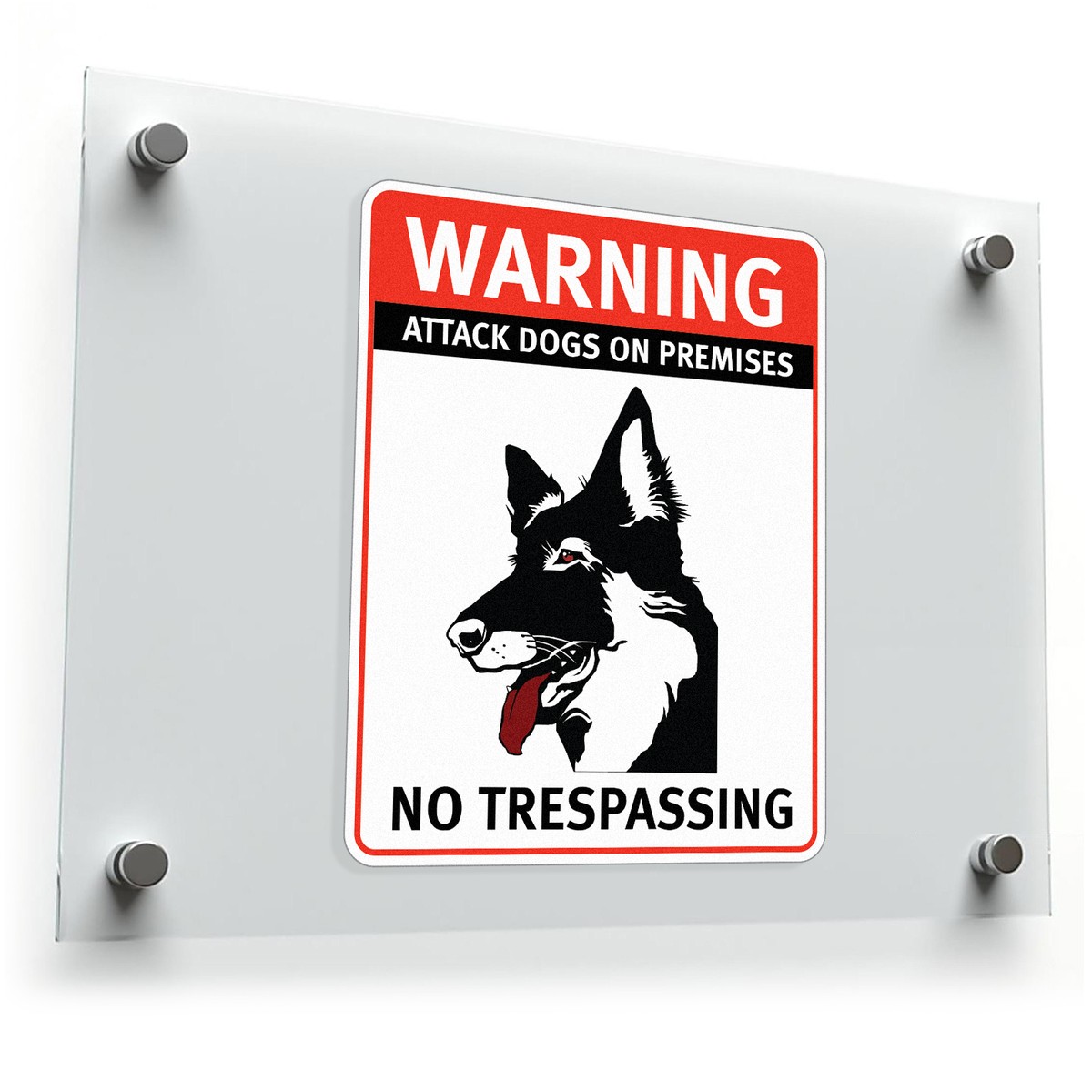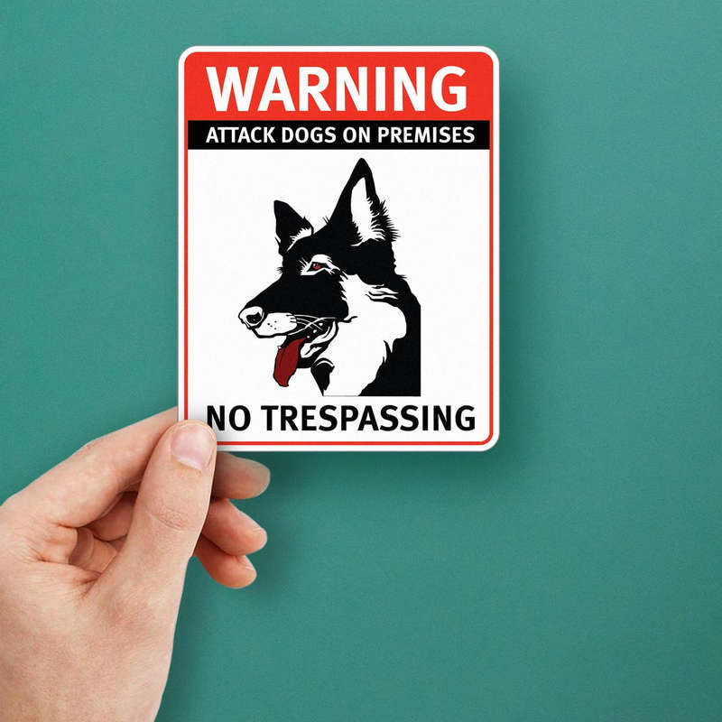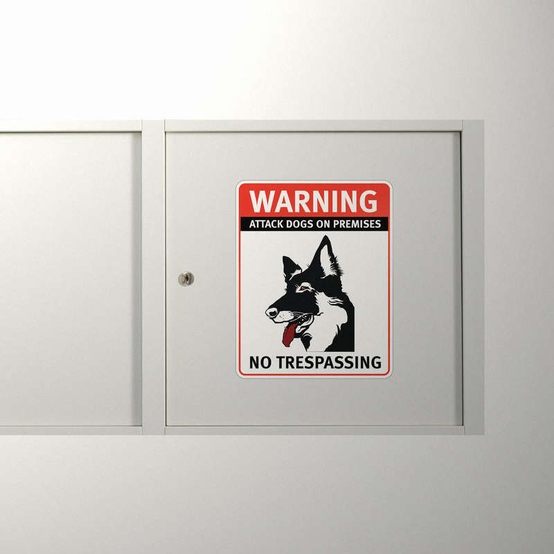 Enhance your property’s security with this bold warning sign sticker, featuring the clear message “Attack Dogs on Premises, No Trespassing” alongside a striking guard dog graphic. Perfect for use on walls, gates, doors, or fences, this safety decal provides a visible and effective deterrent for unauthorized access. Crafted from durable vinyl, it withstands fading, peeling, and weather conditions, ensuring long-lasting visibility. Its easy peel-and-stick application makes it simple to use, and residue-free removability offers flexibility for temporary or permanent setups. Available in multiple size options, this warning sticker is an essential safety tool for homes and businesses alike.