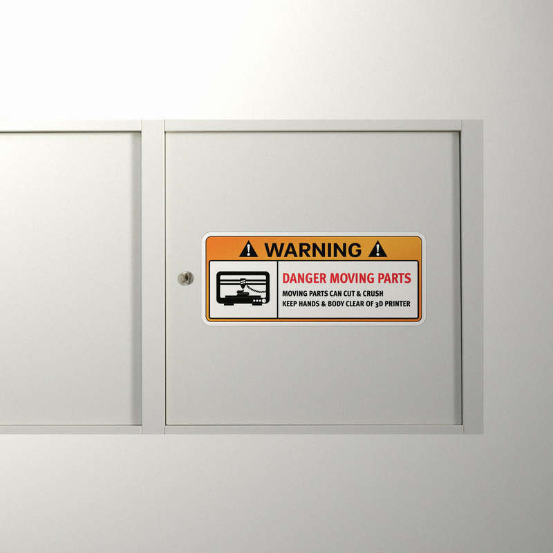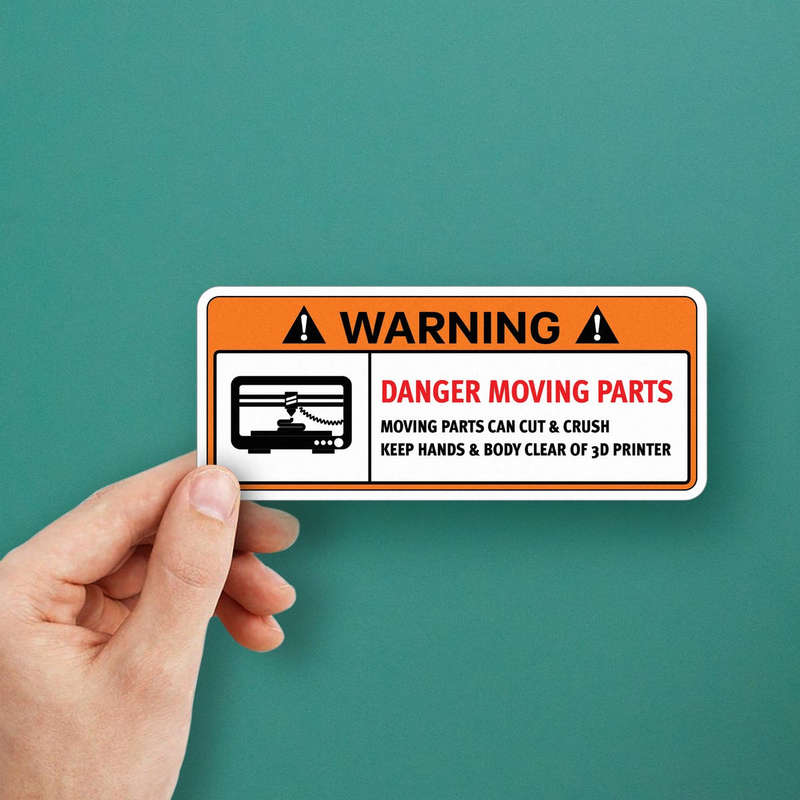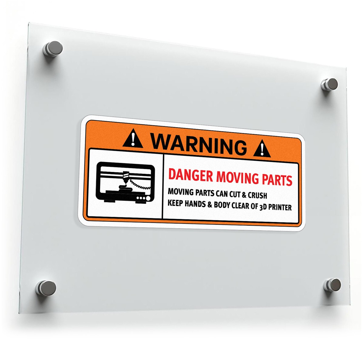 Ensure workplace safety with this Warning Sign sticker, boldly displaying “Danger Moving Parts” to alert users of 3D printers and other equipment. Featuring a bright orange background and contrasting black and red text, this decal is highly visible and effective in promoting safety. Crafted from durable vinyl, it resists fading, wear, and weather, ensuring long-lasting use in indoor and outdoor environments. Ideal for 3D printers, manufacturing equipment, and workshops, this sticker helps minimize accidents and improve safety awareness. Easy to apply and residue-free upon removal, it’s a practical addition to any safety-conscious setting.