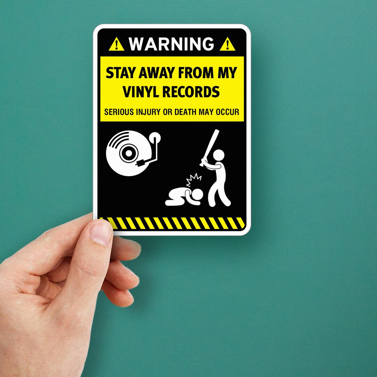 Keep your vinyl records safe in style with this humorous warning sign sticker! Featuring the bold message “Stay Away From My Vinyl Records,” this durable, waterproof vinyl decal is a must-have for any music enthusiast who takes their collection seriously. Whether applied to a wall, door, or record cabinet, the bold black and yellow design adds a fun and retro touch to any space. Built to last, this sticker is easy to apply and remove, ensuring your collection is both protected and stylish. Available in multiple sizes, it’s the perfect gift for any record lover.