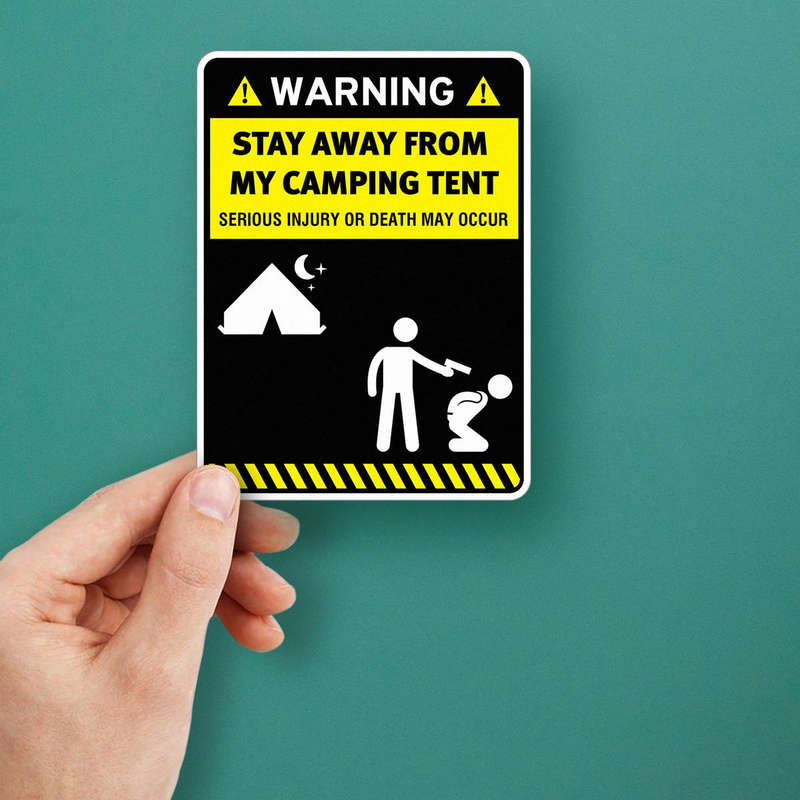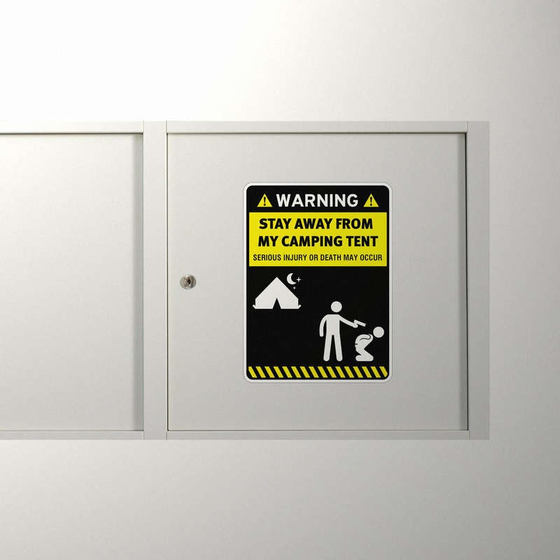 Add both protection and humor to your campsite with this “Warning: Stay Away from My Camping Tent” sticker. Designed to ward off unwanted visitors while giving fellow campers a chuckle, this decal is perfect for those who take their tent security seriously. Made from durable, waterproof vinyl, it withstands harsh outdoor conditions and can be easily applied to your tent, cooler, or other camping gear. Whether you’re setting up in a crowded campground or in the wilderness, this sticker ensures your space stays respected while adding a lighthearted touch to your camping experience. Available in multiple sizes.