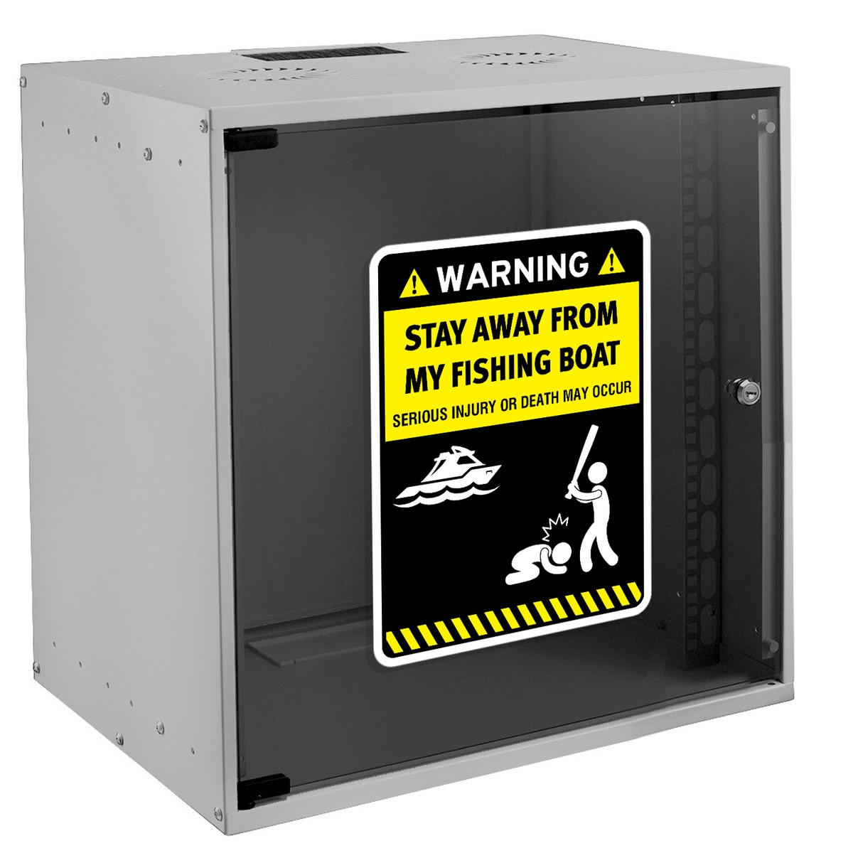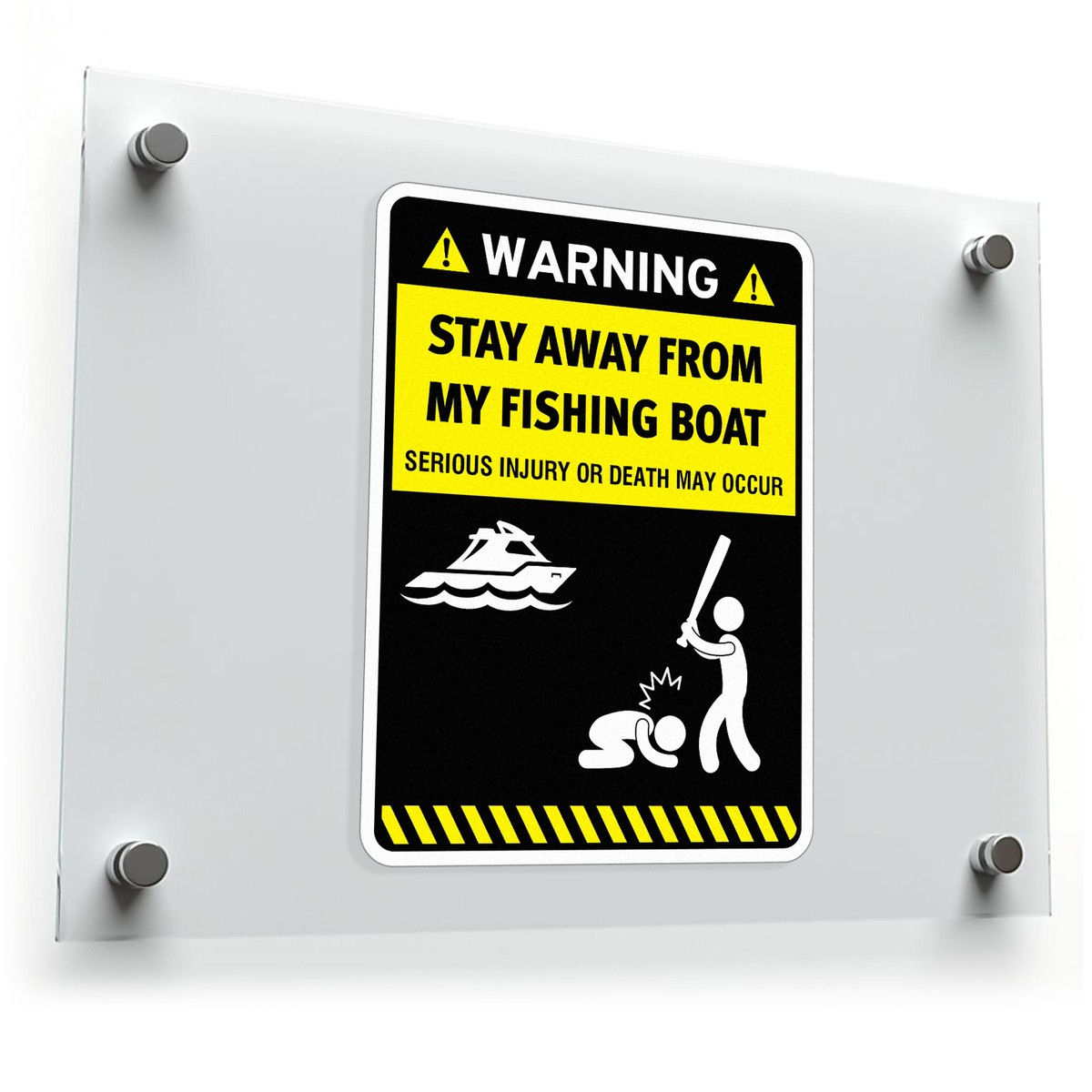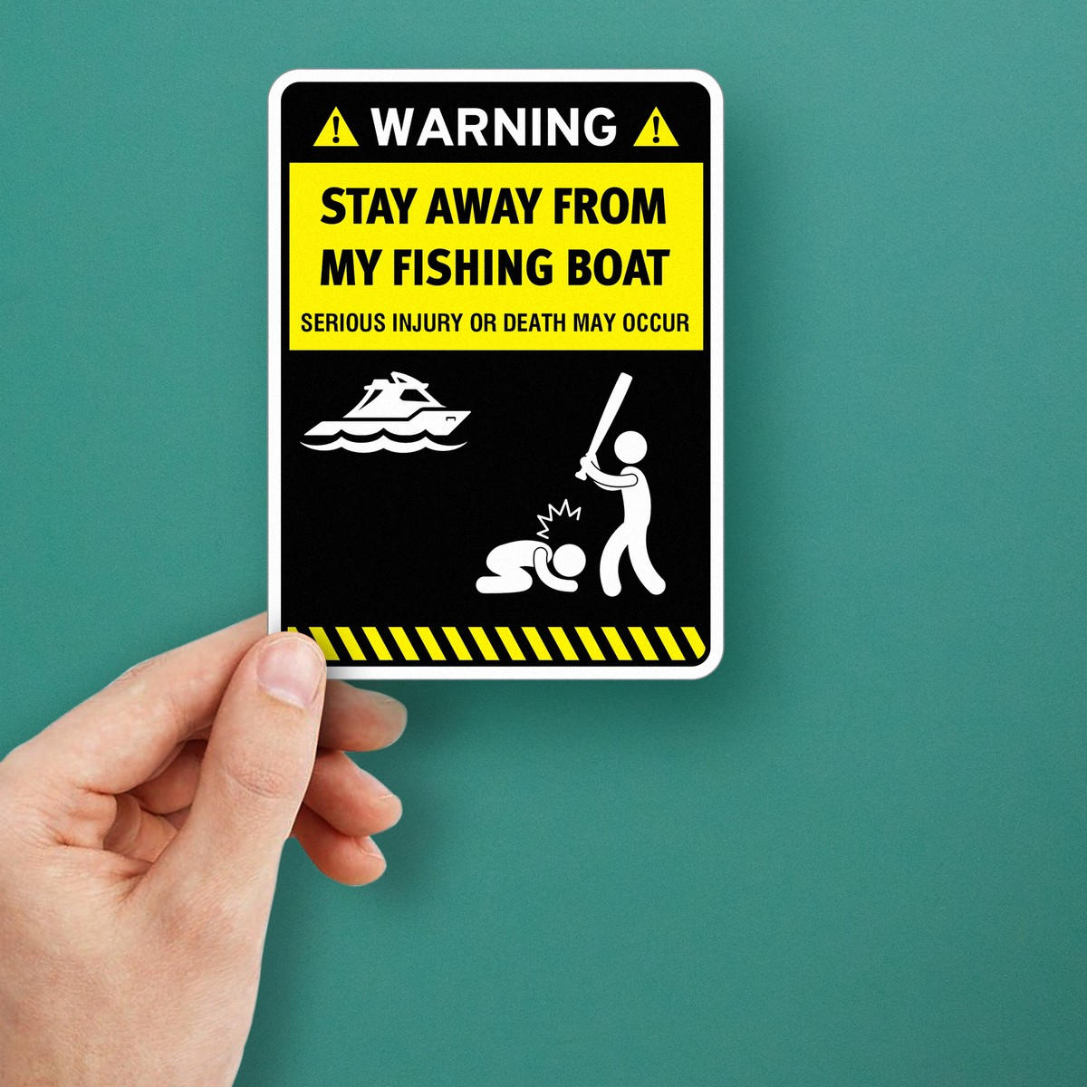 Add a humorous yet serious warning to your fishing boat with this bold vinyl sticker. Featuring the message “Stay Away from My Fishing Boat – Serious Injury or Death May Occur” and a comical illustration, this durable and weatherproof sticker is designed for the tough conditions of boating life. Whether applied to the hull or cabin, this sticker ensures your boat remains undisturbed while providing a touch of humor. Easy to apply, the high-quality vinyl ensures long-lasting use even in outdoor marine environments. Available in multiple sizes to suit your boat’s needs.
