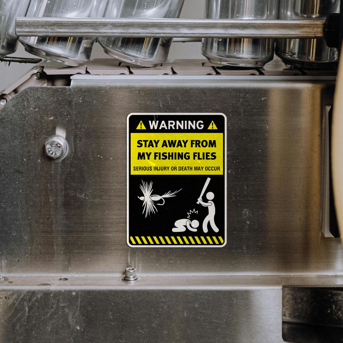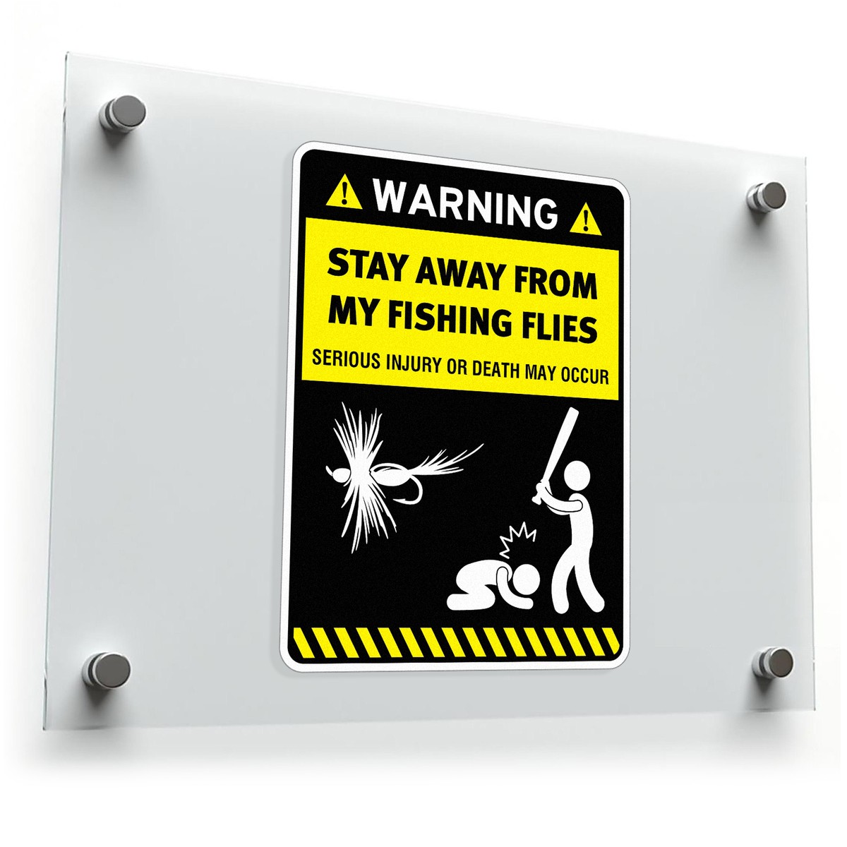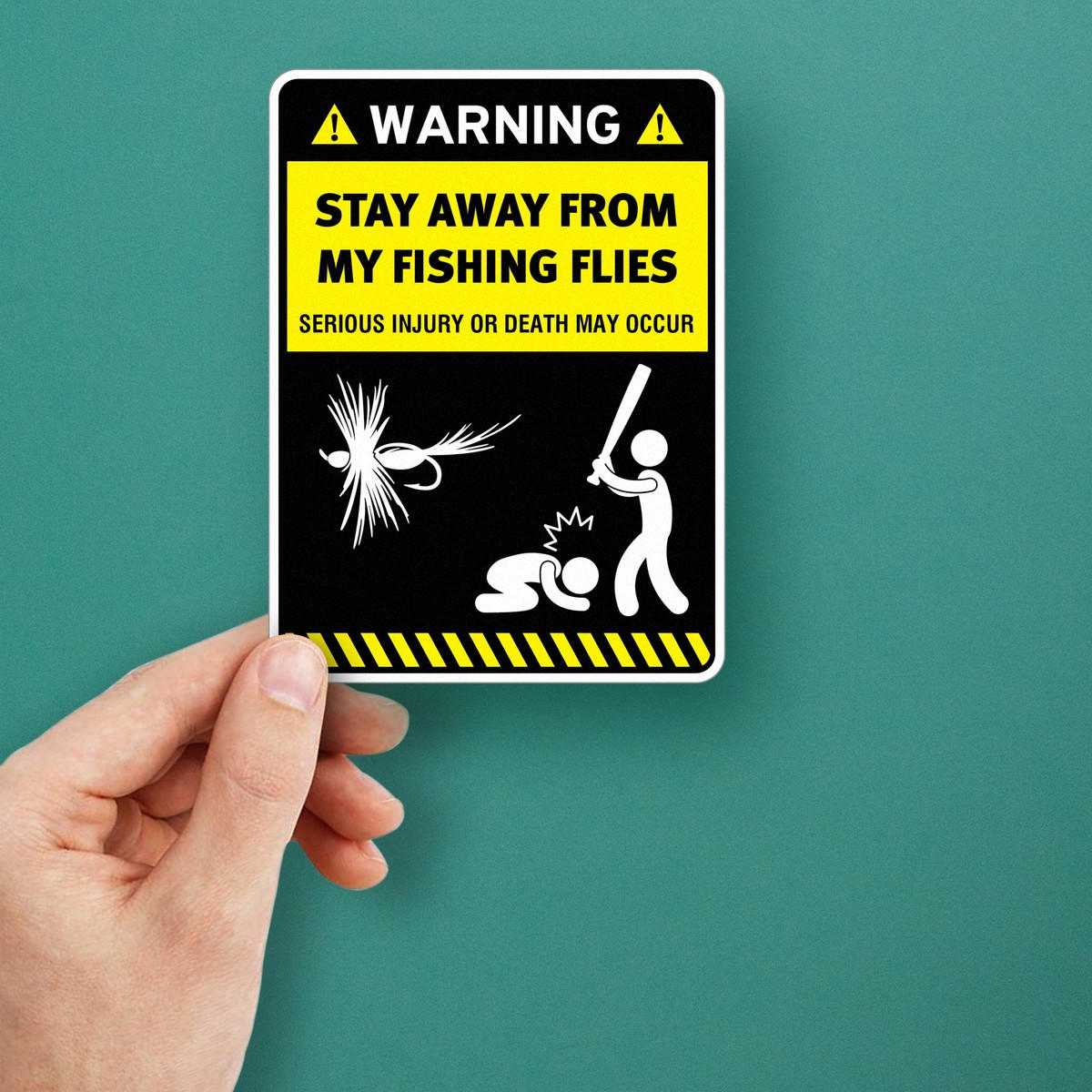 Add some humor to your fishing adventures with this “Warning: Stay Away from My Fishing Flies” sticker, a must-have for fishing enthusiasts. This vinyl decal serves as a funny yet effective warning to others to keep away from your precious fishing flies and gear. Made from durable, weather-resistant vinyl, it’s perfect for outdoor use on boats, tackle boxes, or cars. The bold yellow and black design ensures high visibility, making your message clear. Easy to apply and remove, this fishing decal is available in multiple sizes to suit your needs.