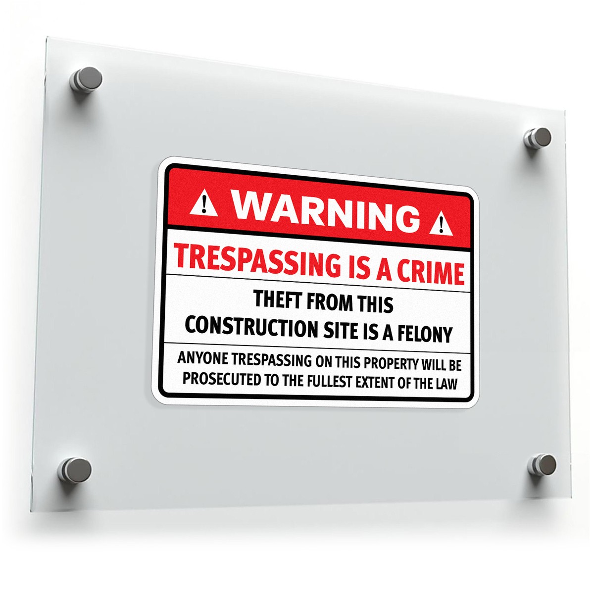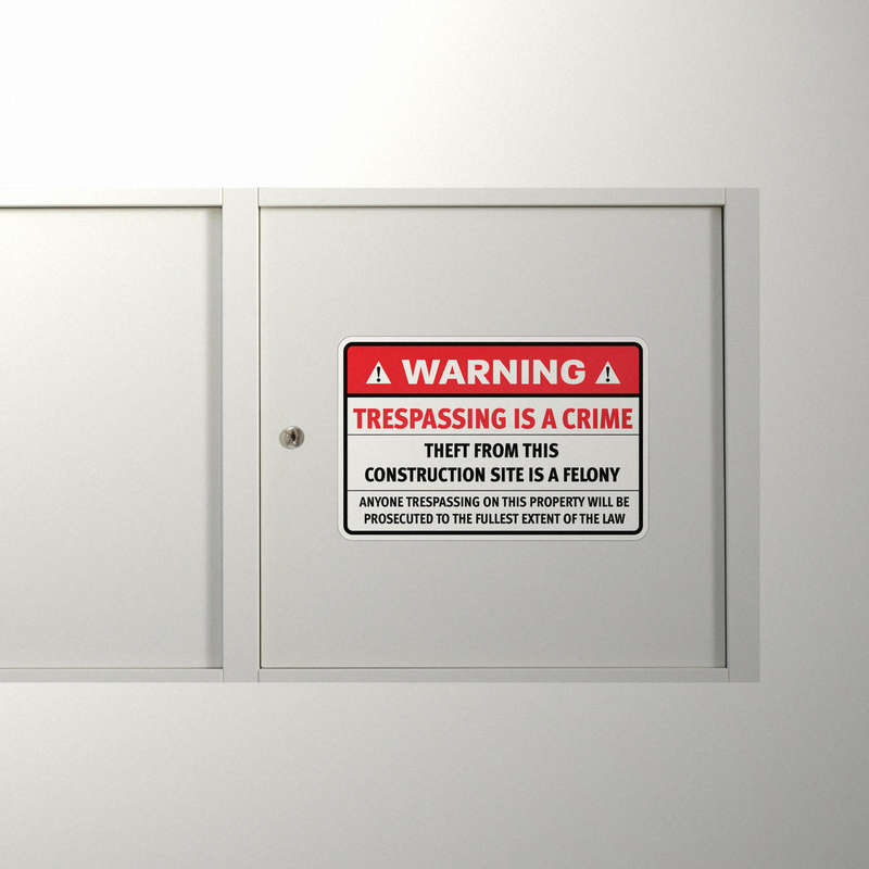 Secure your property and enforce safety measures with this “Warning: Trespassing Is a Crime” sticker. Featuring a bold red, black, and white design, this durable vinyl decal delivers clear messaging, including “Theft from This Construction Site Is a Felony” and legal prosecution warnings. Perfect for construction sites, restricted areas, or private properties, it serves as an effective deterrent to unauthorized access. The weather-resistant material ensures reliable performance in outdoor environments, while the adhesive backing allows for easy application on fences, equipment, or walls. Available in multiple size options, this sticker combines durability and professional design for enhanced security.