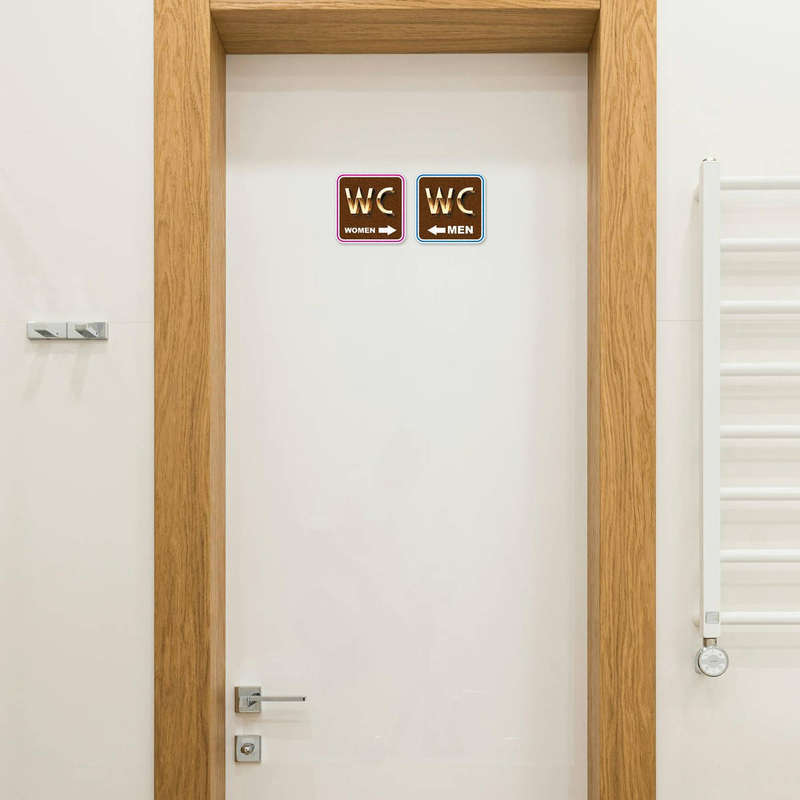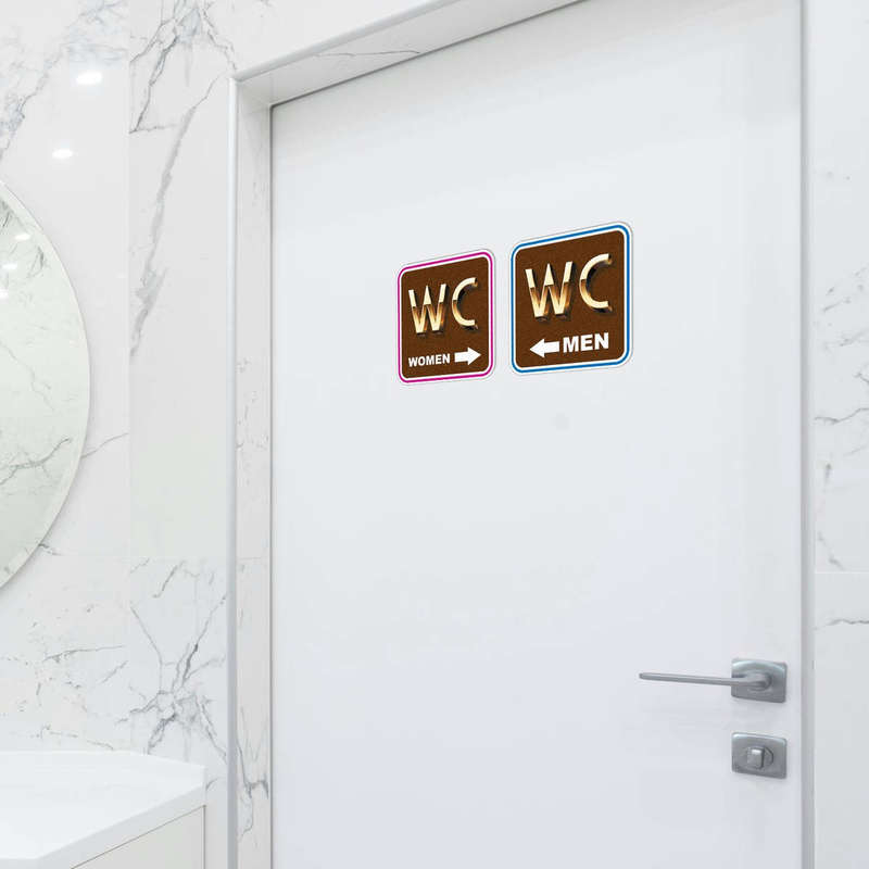 Make restroom navigation effortless with these bold and stylish WC bathroom sign stickers. Featuring 3D gold lettering on a brown background, these vinyl decals include directional labels for “Men” and “Women,” with color-coded borders—pink for women and blue for men. Perfect for restroom doors in restaurants, offices, and other facilities, these stickers are made from durable vinyl that resists wear and tear, ensuring long-lasting use. Easy to apply and remove, they offer a professional and clear solution for restroom labeling. Available in multiple size options for seamless customization.