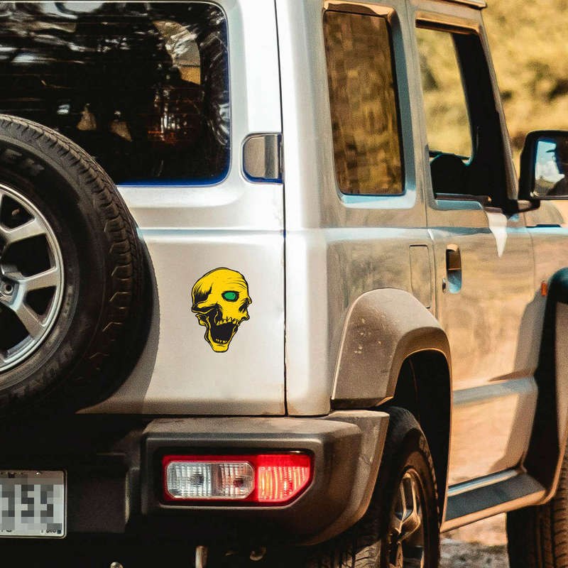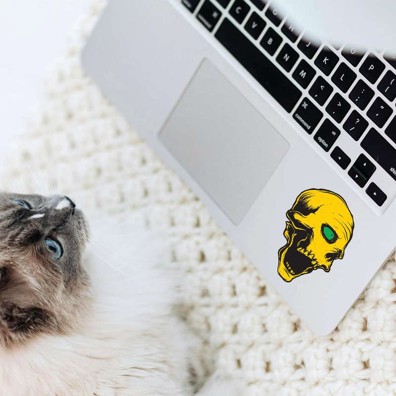 Make a bold statement with this yellow skull vinyl sticker featuring a vivid green eye and intricate gothic detailing. This striking design is perfect for adding an edgy vibe to your laptops, cars, walls, or other personal items. Crafted from high-quality, weatherproof vinyl, it resists fading and peeling, ensuring long-lasting durability indoors and outdoors. Easy to apply and remove without leaving residue, this sticker is a hassle-free way to showcase your unique style. Available in multiple size options, it’s a fantastic addition for lovers of gothic art, alternative aesthetics, or anyone looking to add a dramatic flair to their belongings.