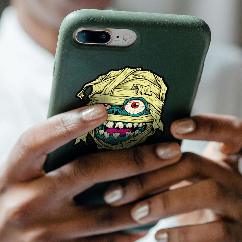 Zombie Mummy Sticker 🧟 Creepy and Fun Design: This bold sticker features a zombie mummy with wild cartoon details, including exposed teeth and a creepy single eye. Perfect for adding a touch of spooky fun to your belongings! 🧟